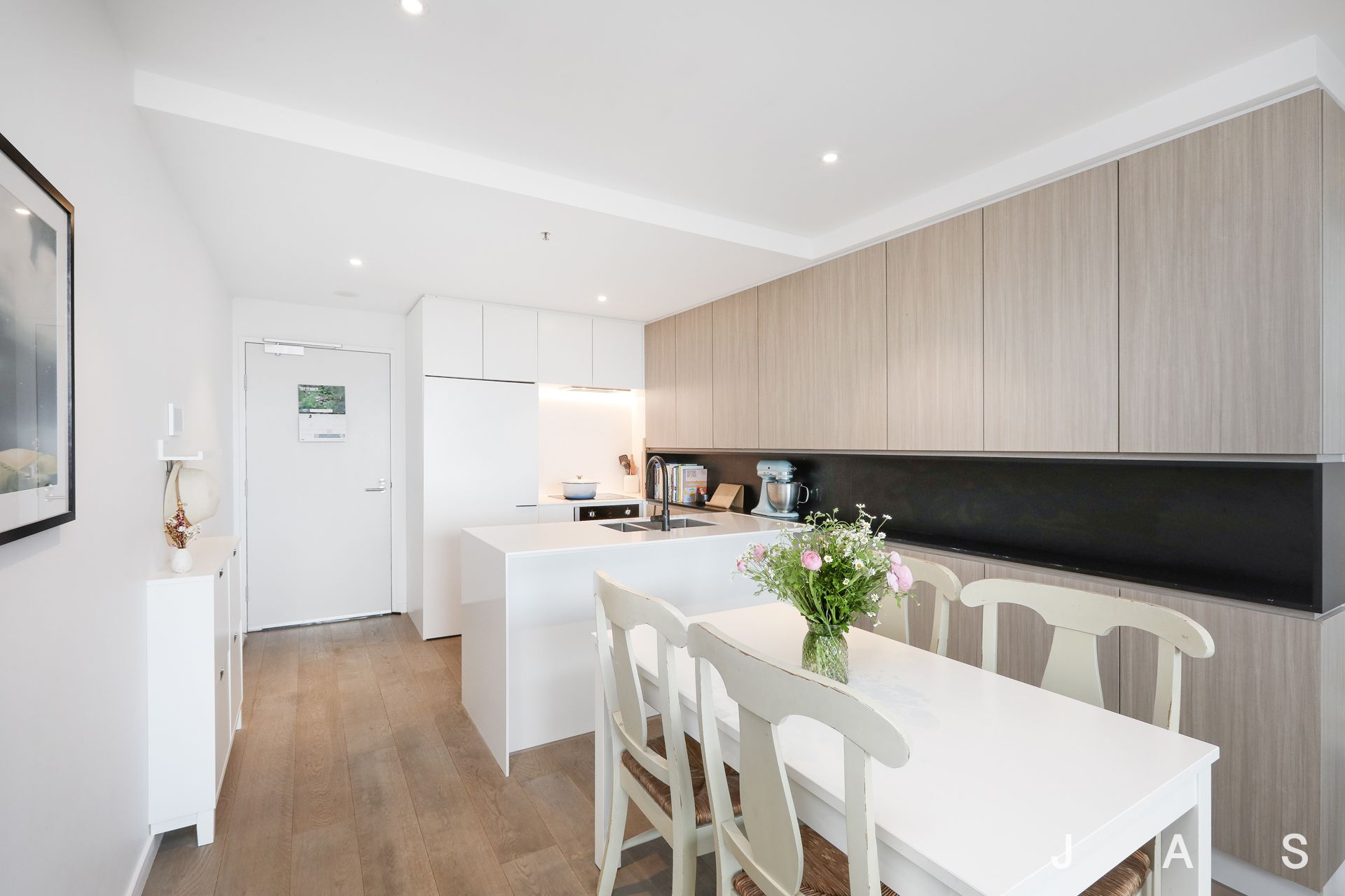 - Designer kitchen featuring stone benchtops and integrated appliances