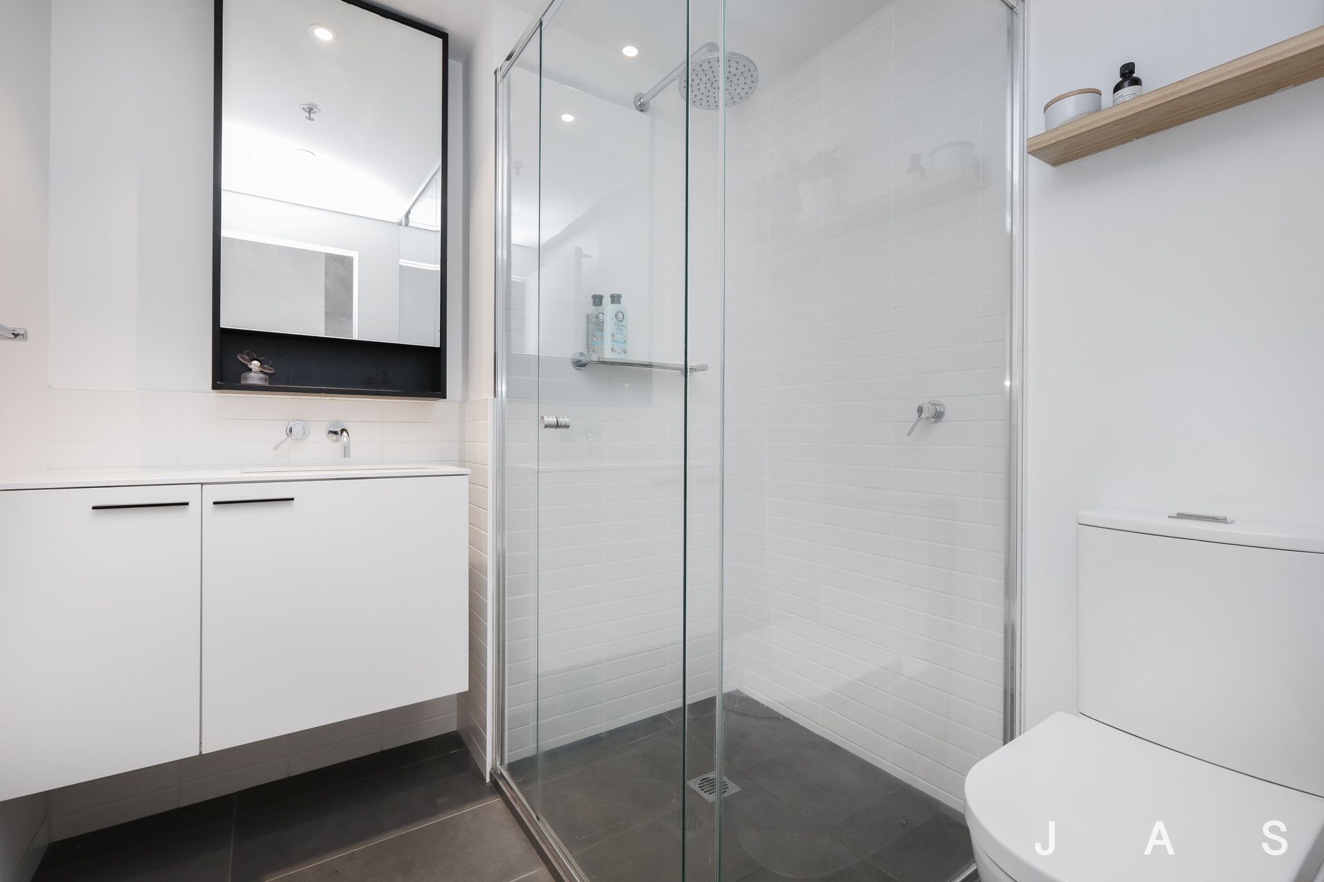 - Elegant, fully tiled bathroom with concealed laundry