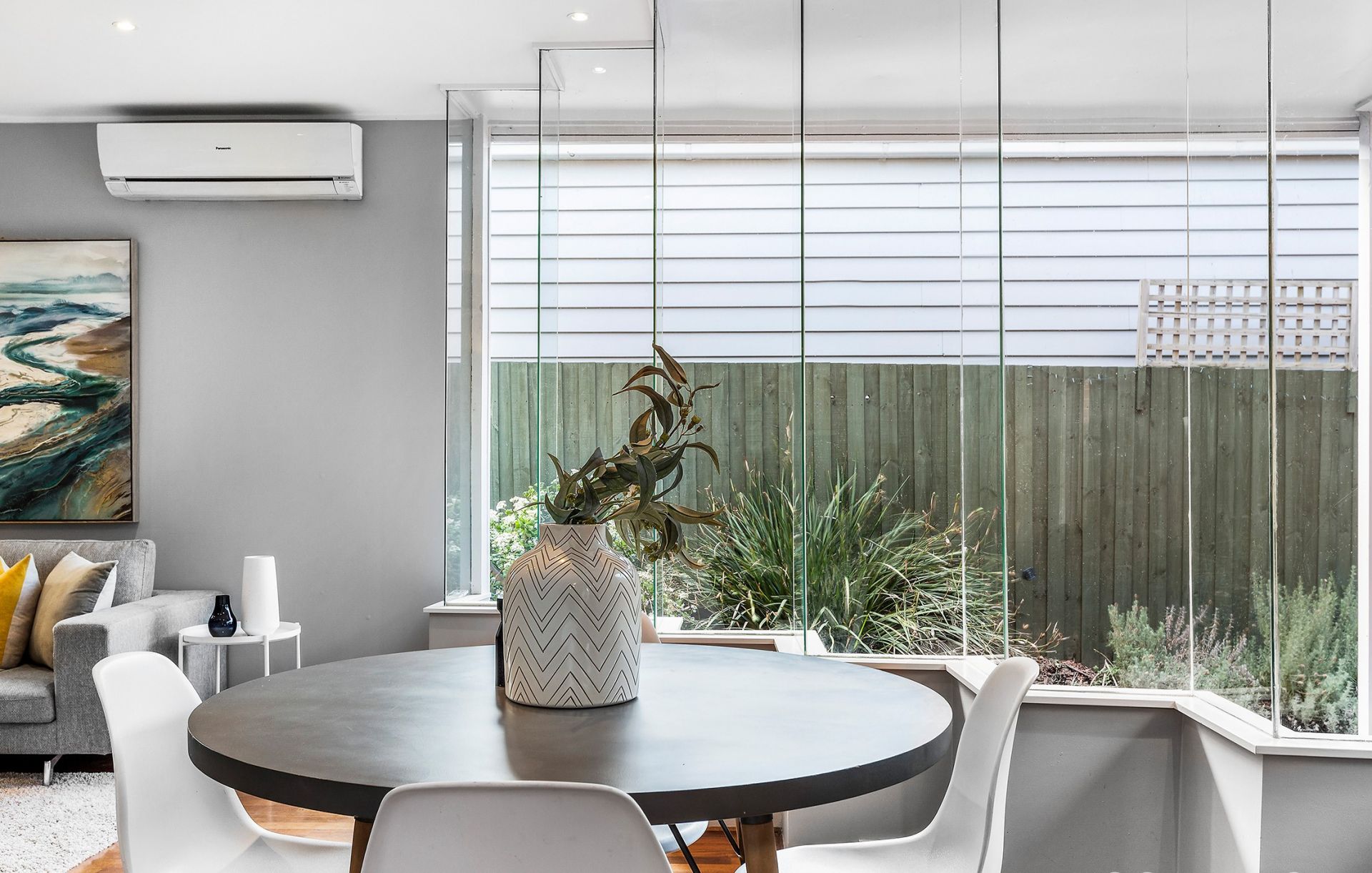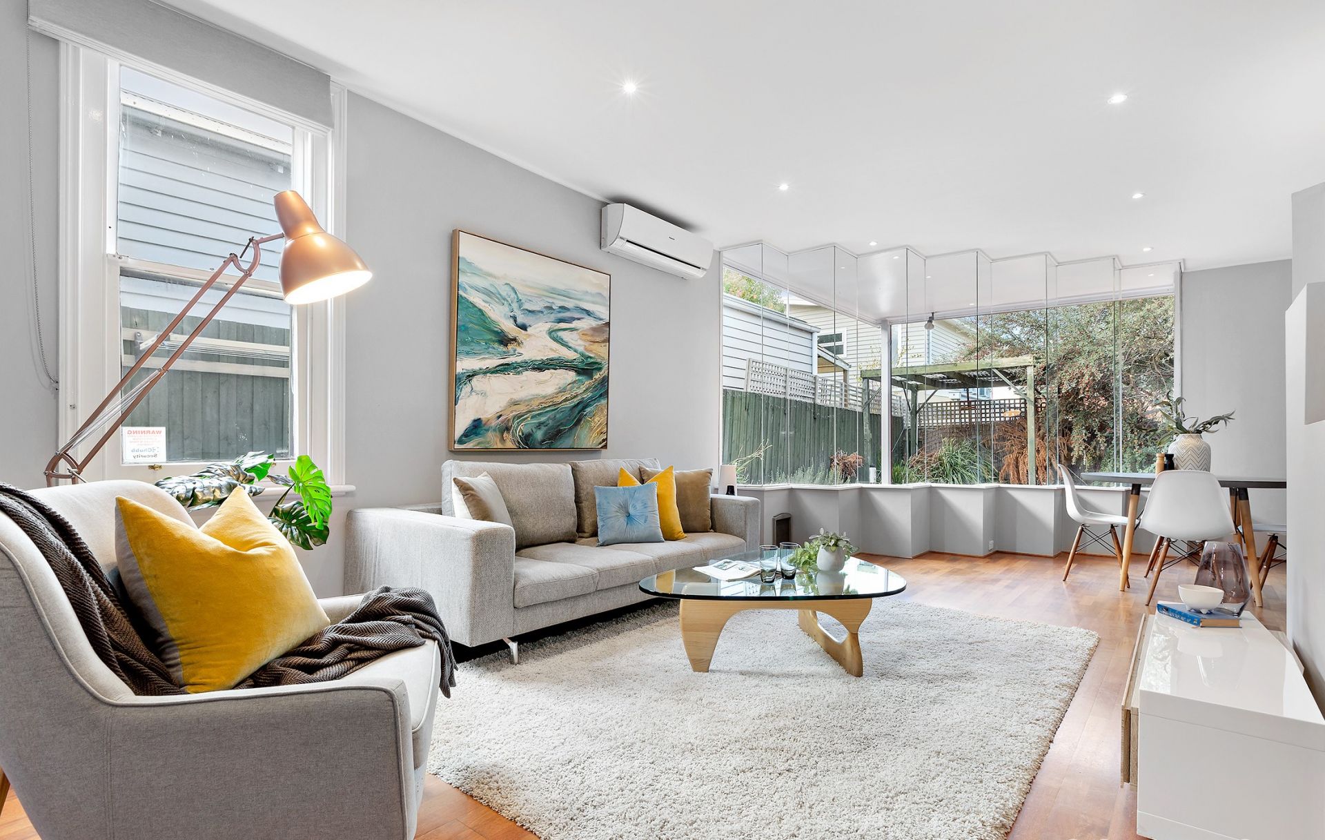 - Living & dining area seamlessly linked by a stylish glass feature wall, allowing for plenty of natural light