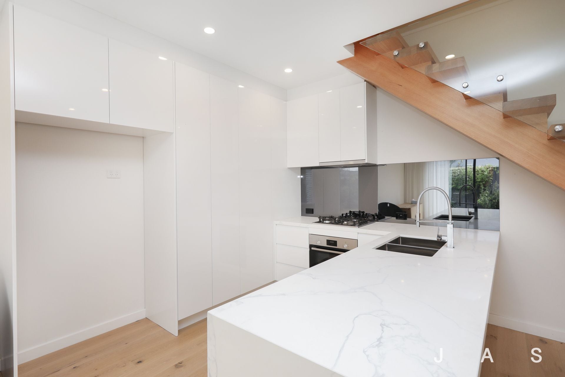 The fully-equipped kitchen features high-end appliances and waterfall stone island bench