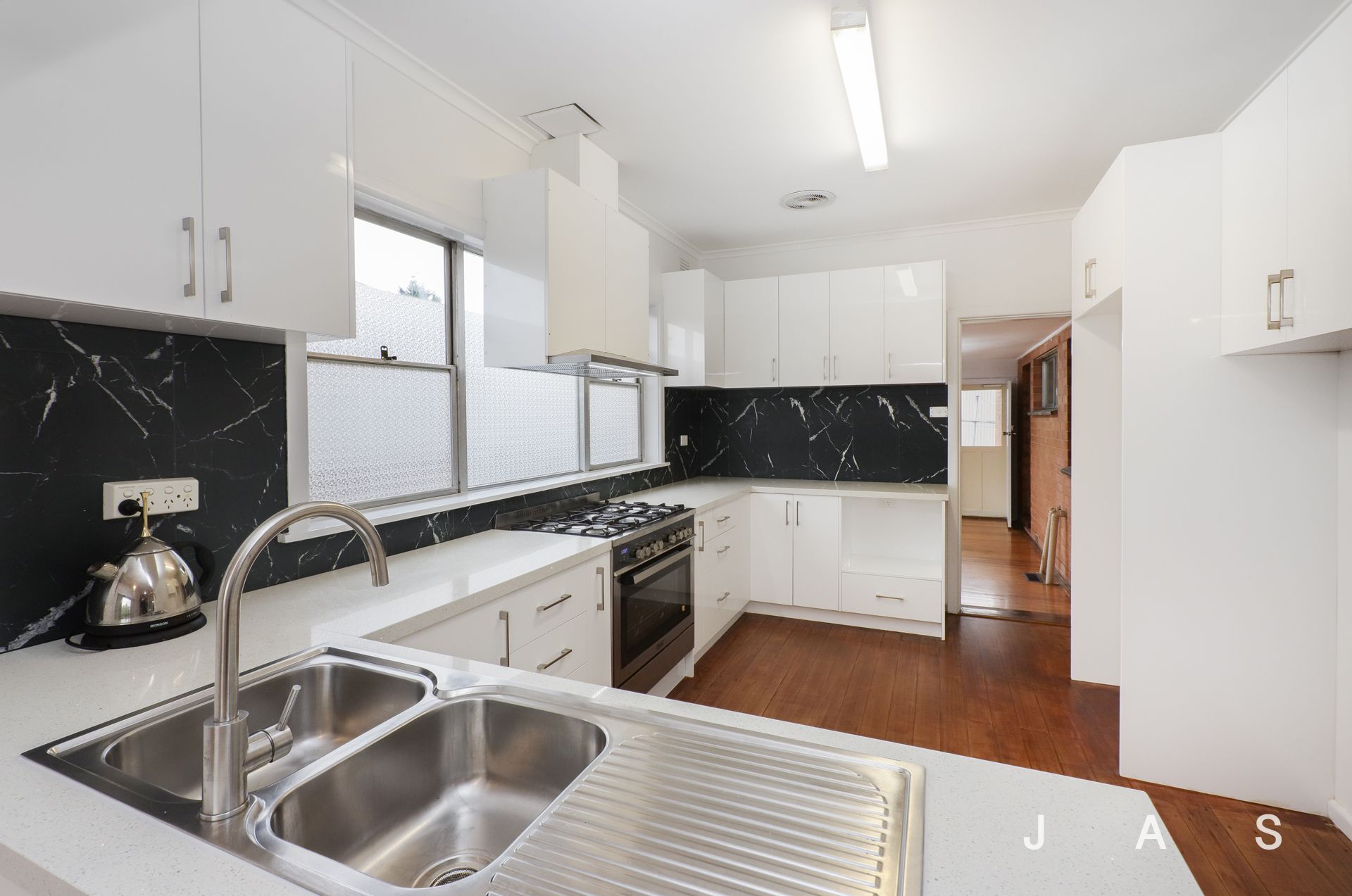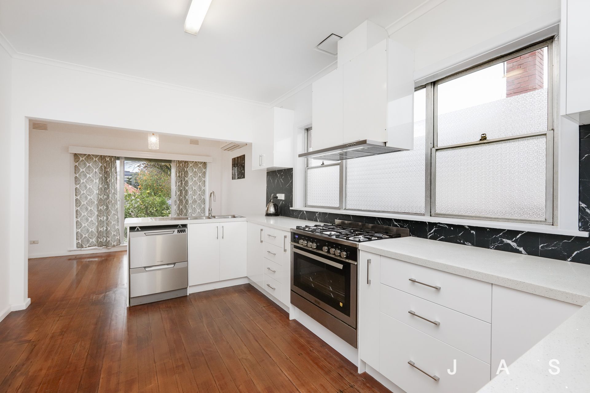 - Stunning contemporary kitchen with stone bench tops, 900mm gas stove, marble tiled splash back and double drawer dishwasher