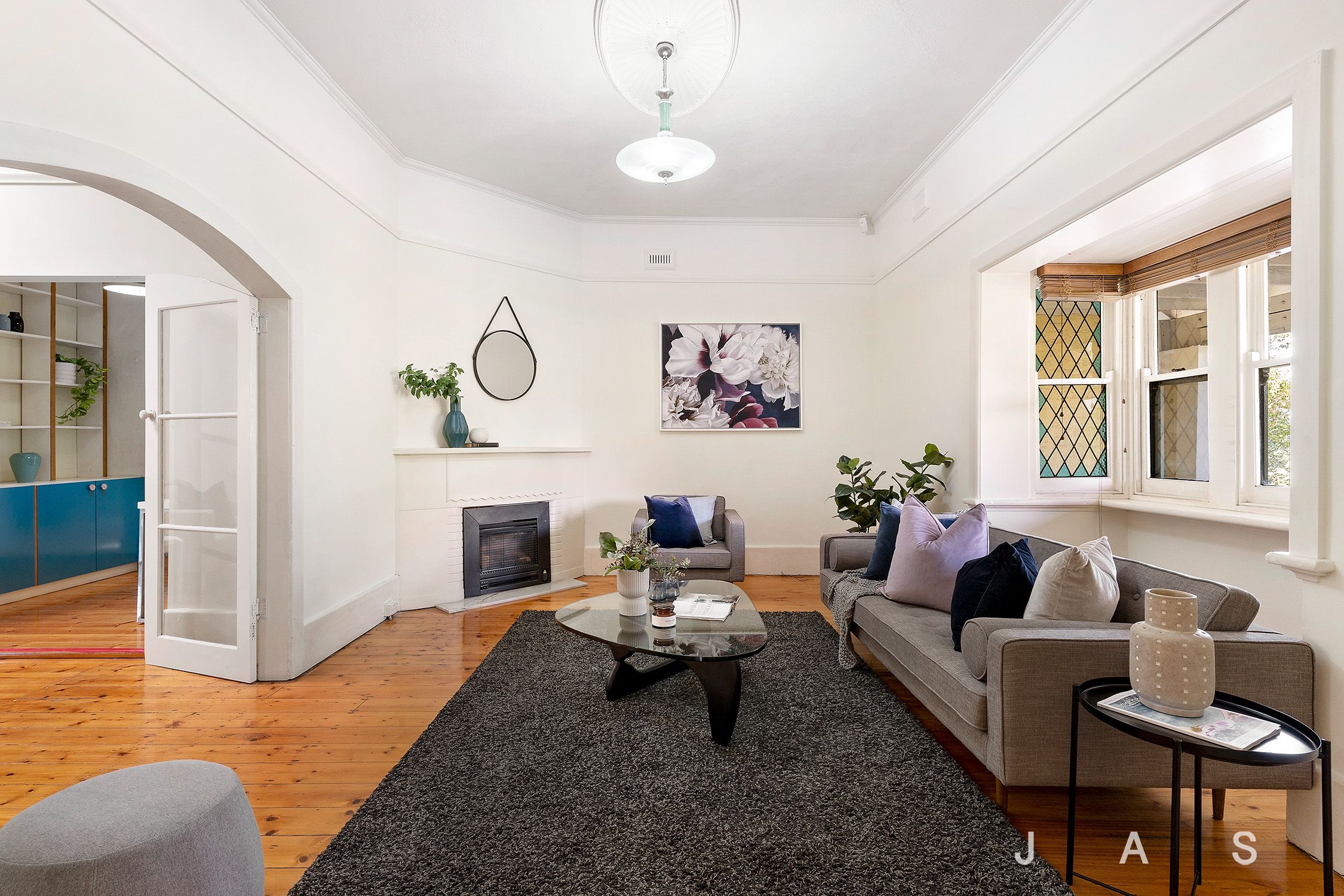 - Stunning living room opens via arched entry to adjoining retreat