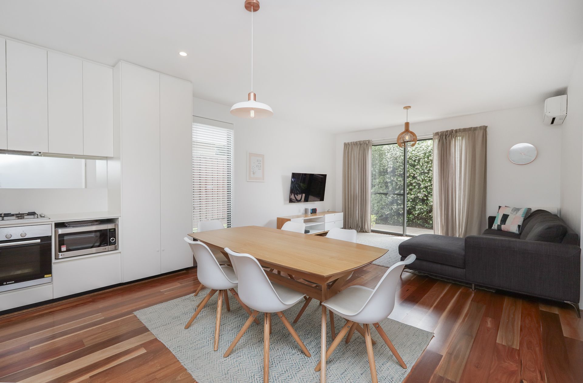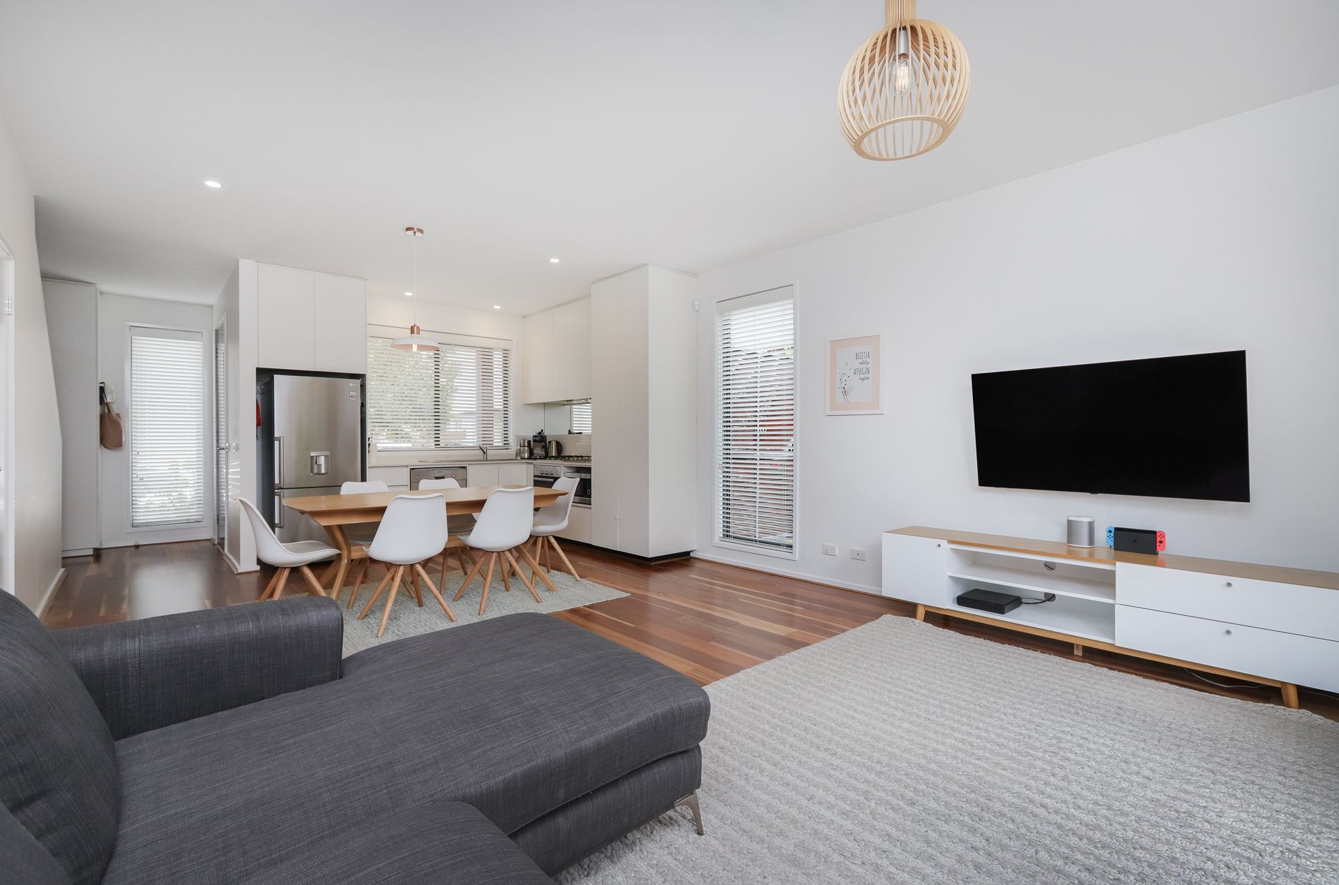 - Stunning open plan kitchen, dining and living rooms with hard wood floors