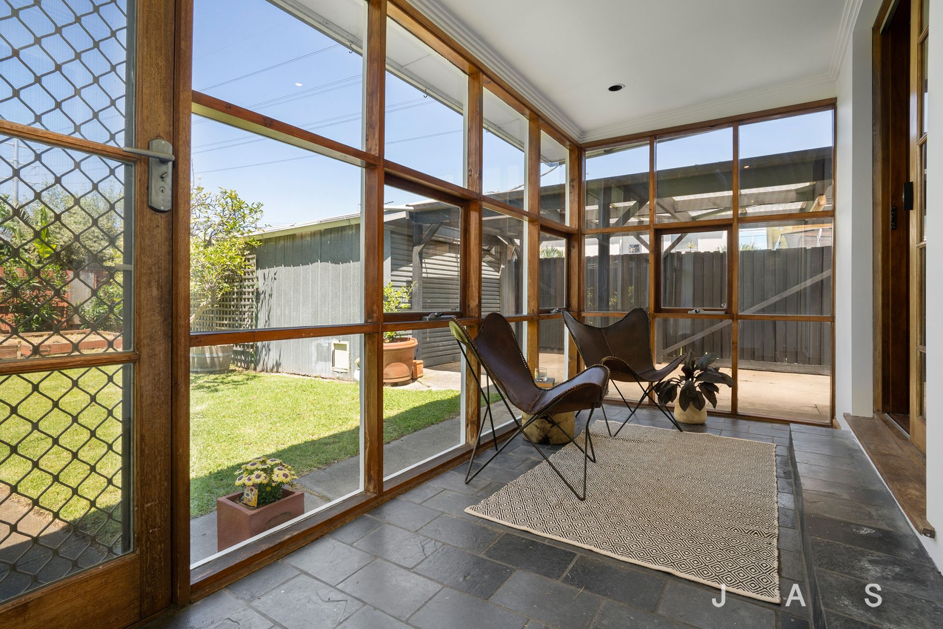 - The slate sunroom overlooks a rear garden with an outdoor pergola area and