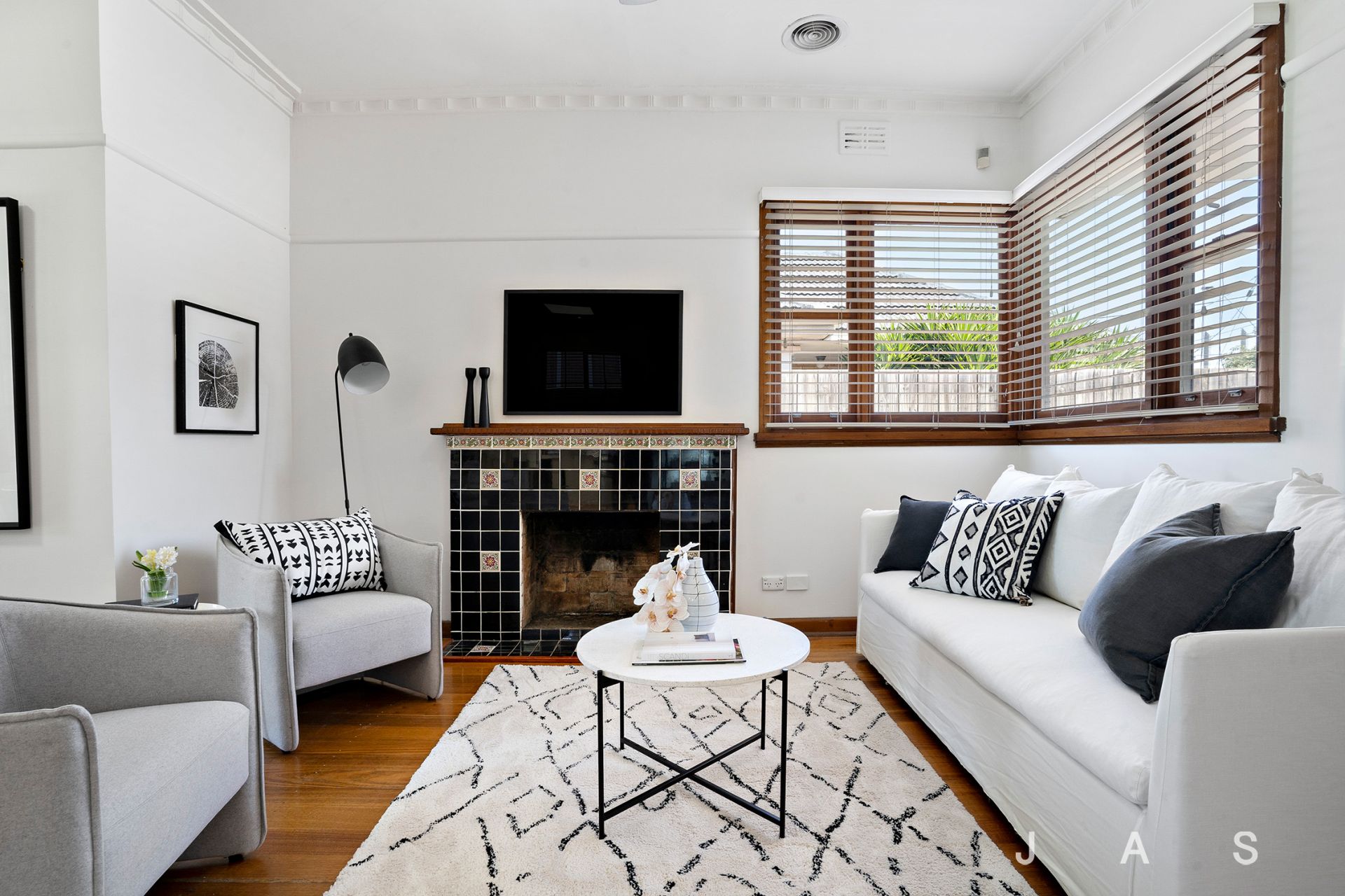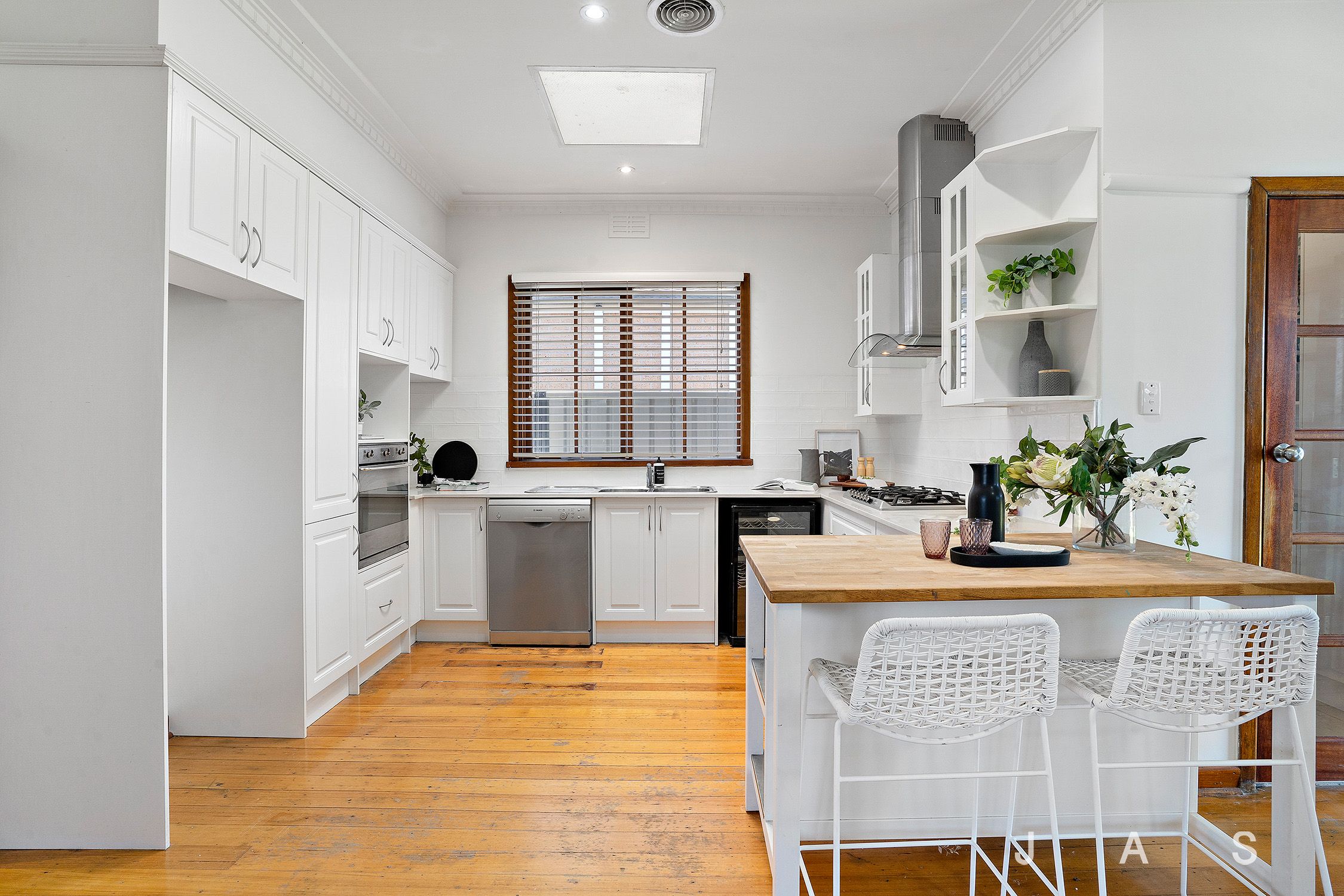 - Open plan living and dining areas boast hardwood floorboards complemented