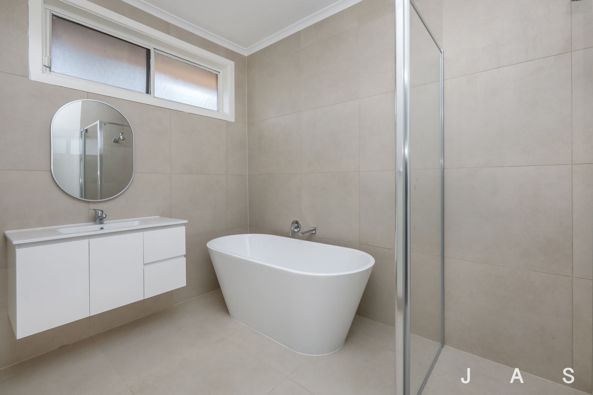 -Central new bathroom with separate shower and bathtub.