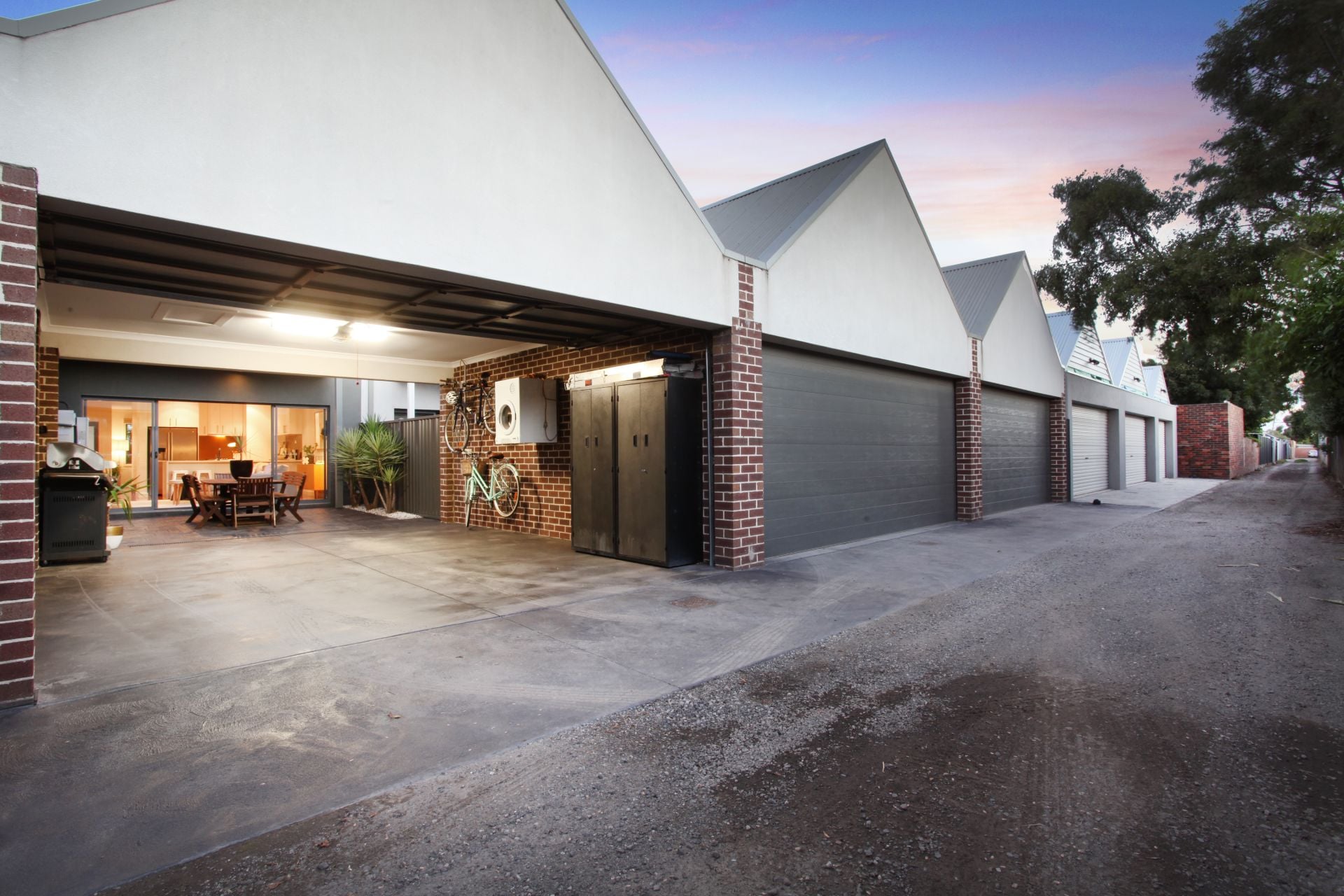 - Large paved entertaining patio + secure off-street parking for two cars via rear ROW