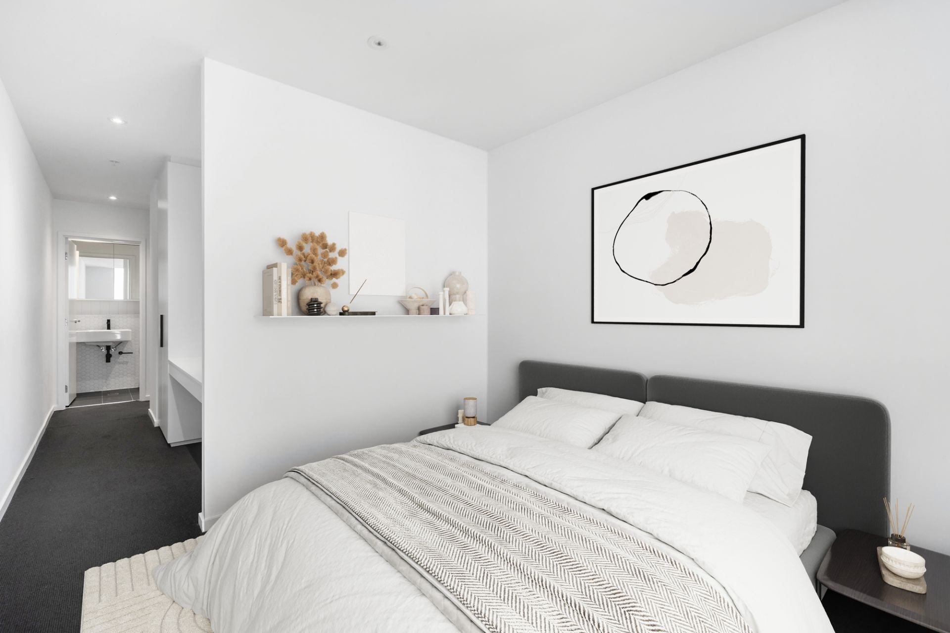 Two carpeted bedrooms with built-in robes include a large master boasting a private approach, an in-built desk and a luxurious ensuite with floor-to-ceiling tiling, a rainfall shower and sleek matte black fixtures. The second bathroom –a twin of the stylish ensuite – is ideally placed for easy access from the second bedroom and living space, adding extra appeal to this beautifully designed home.