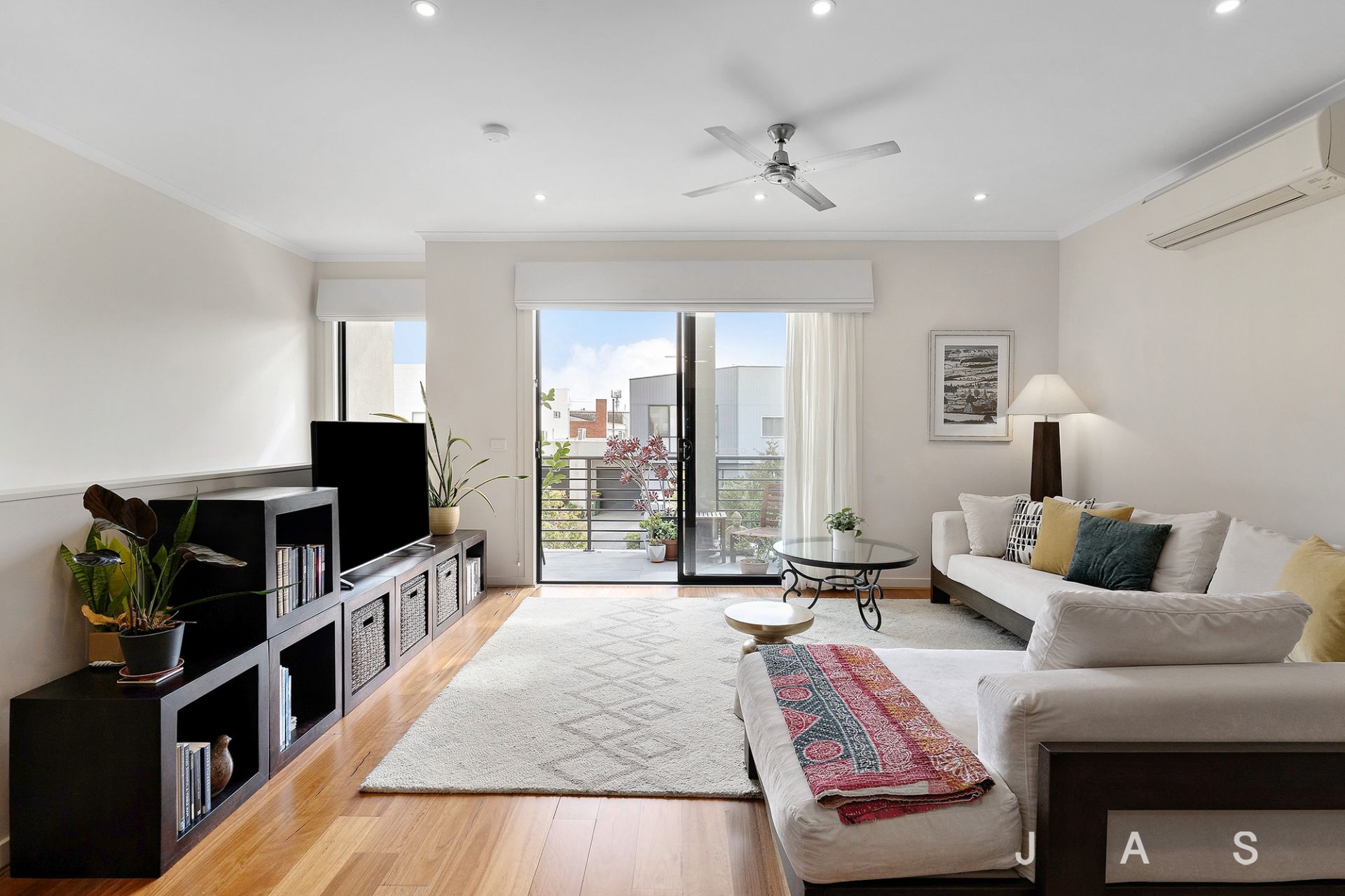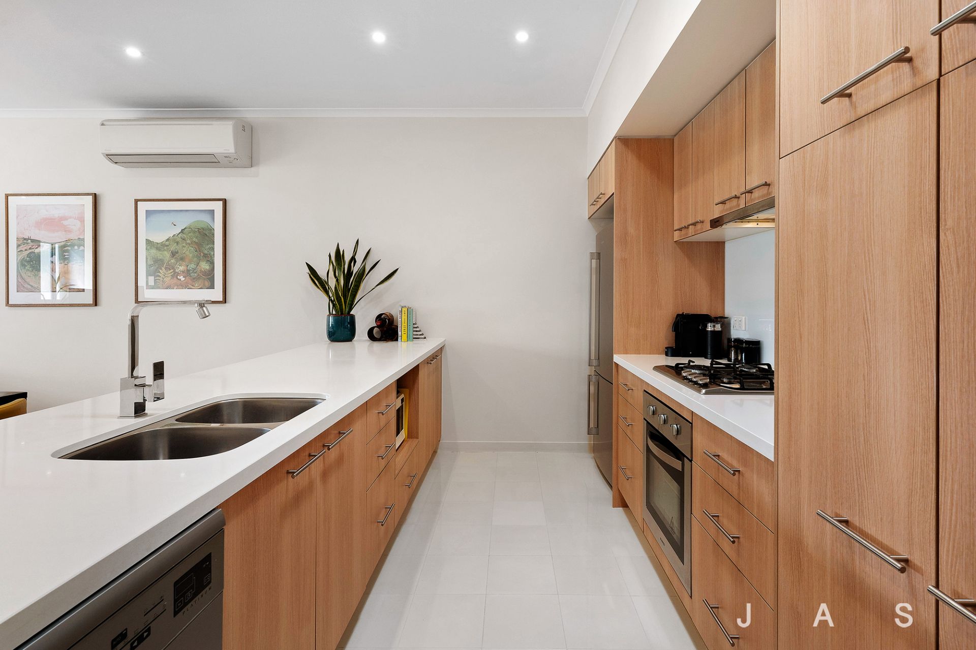 The lower level is devoted to rest and relaxation, with two generous bedrooms with built-in robes offering inviting retreats. The large master also includes a study nook, while both bedrooms enjoy heating and nearby access to the bright bathroom, where a rainfall shower offers everyday luxury.