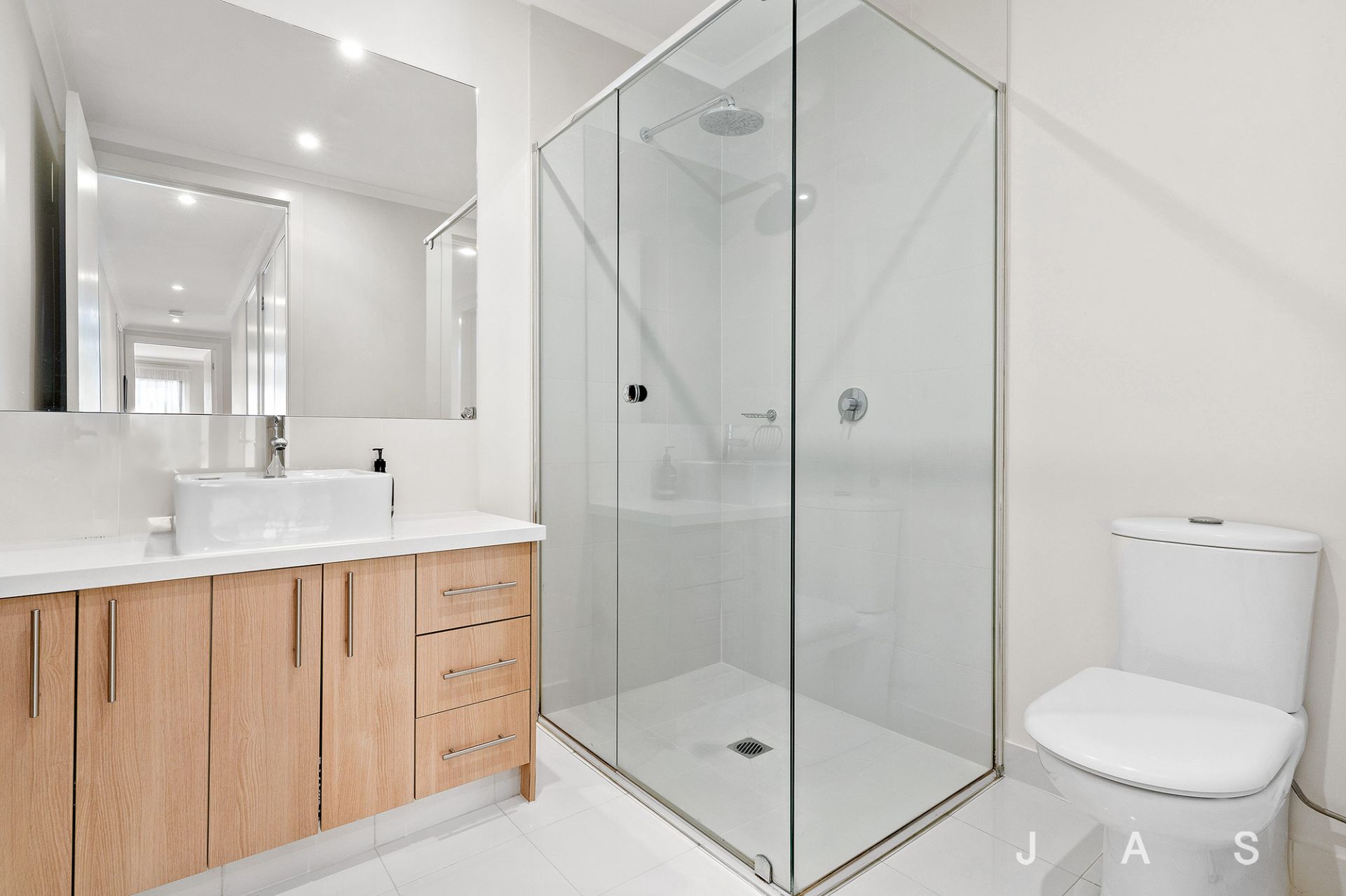 • Neat-as-a-pin bathroom with rainfall shower