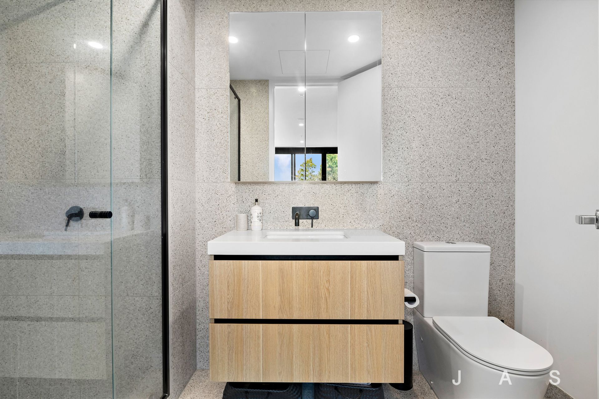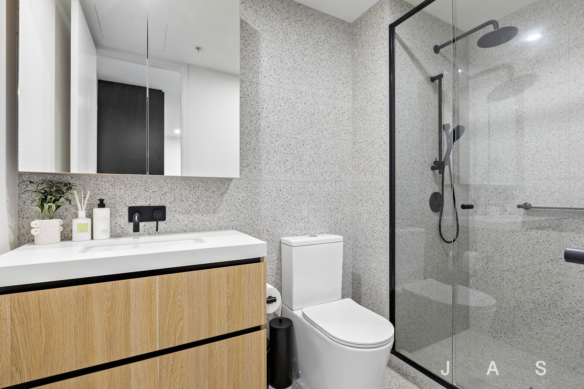 Two privately positioned bedrooms enjoy built-in robes and direct balcony access, with the larger master boasting a sleek ensuite and the second bedroom enjoying exclusive use of the second bathroom – a twin of the ensuite, with floor-to-ceiling tiling, matte black tapware and a luxurious rainfall shower.