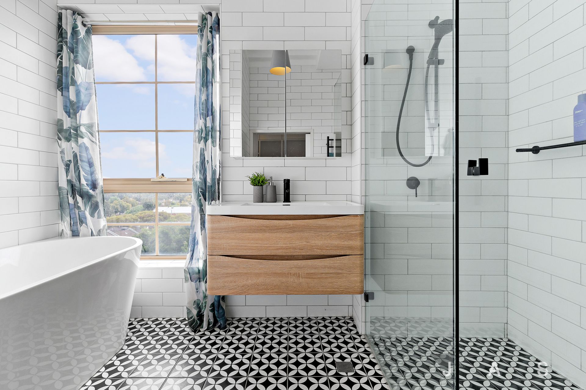 • Luxe, fully tiled bathroom with bathtub, walk-in shower, heated towel rail, floating timber vanity + separate powder room