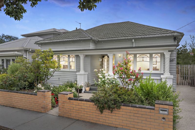 Connected living and dining zones offer a spacious family hub, with the adjoining kitchen offering modern cooking with heritage character. Two bedrooms with built-in robes include a large master with views of the cottage-style front garden to wake up to. Servicing the bedrooms is the centrally positioned bathroom, where a bath with an overhead shower awaits.