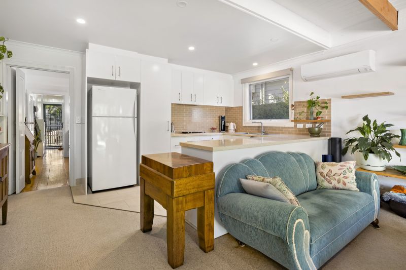 The u-shaped kitchen features sleek stone benchtops and stainless-steel appliances, while the carpeted family zone is crowned by a soaring ceiling with exposed beams and opens to the back garden for easy indoor/outdoor living. Dine and entertain alfresco on the covered deck and host bigger celebrations on the brick-paved patio, which doubles as off-street parking thanks to secure rear laneway access. The rest of the back garden is a leafy oasis, offering lush lawn and plenty of space for the kids to play.