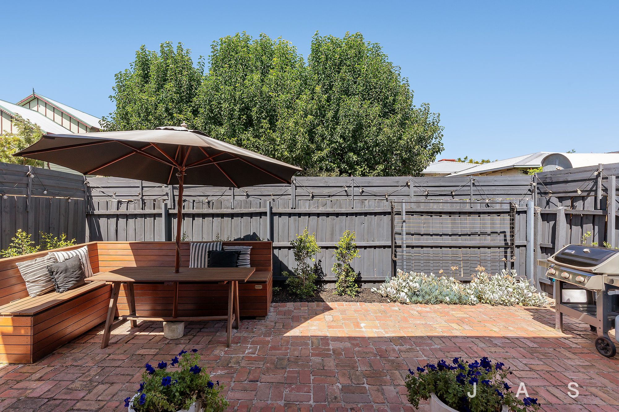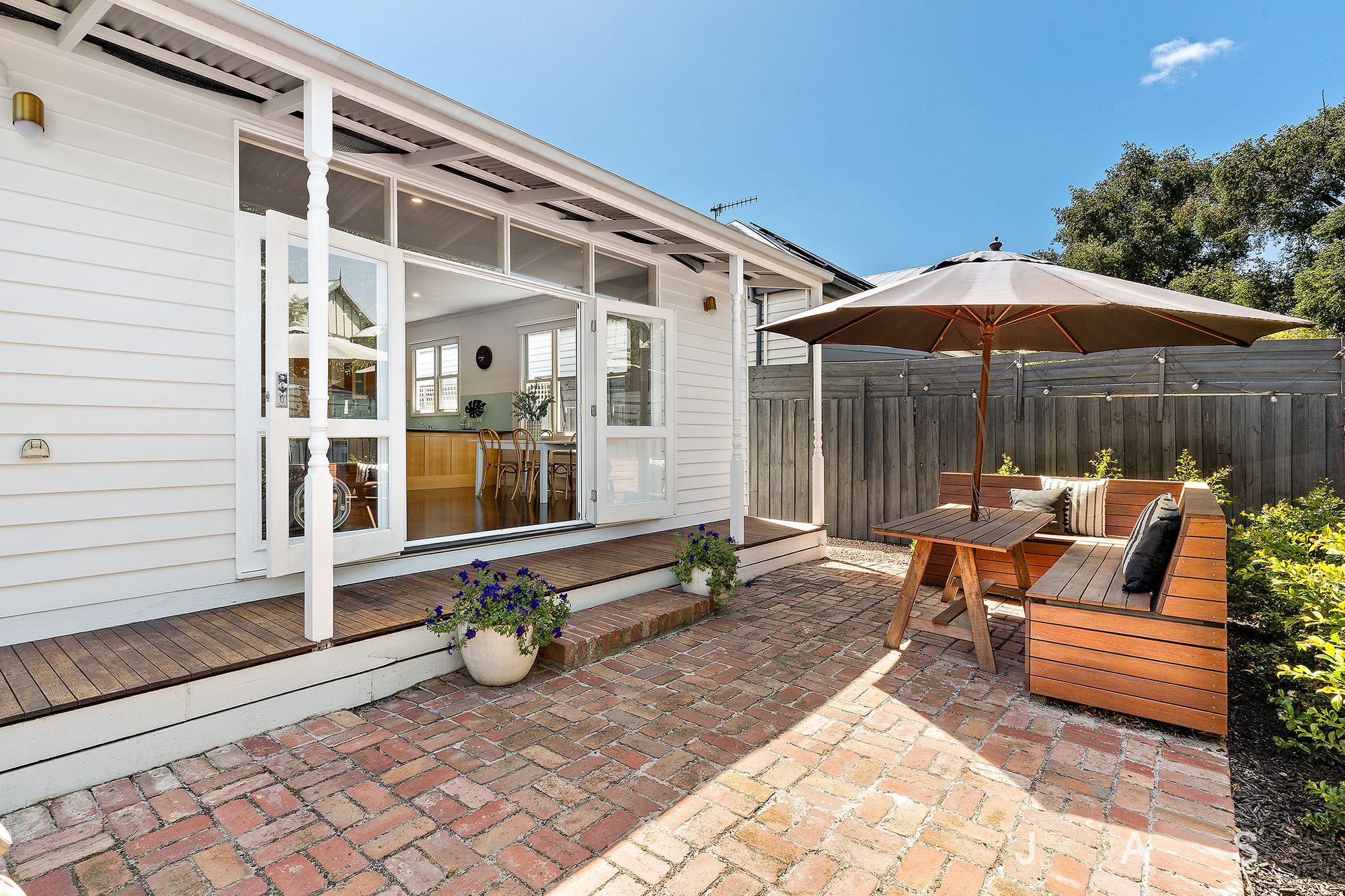 • Private entertainer’s garden with deck and paved courtyard with in-built bench seating