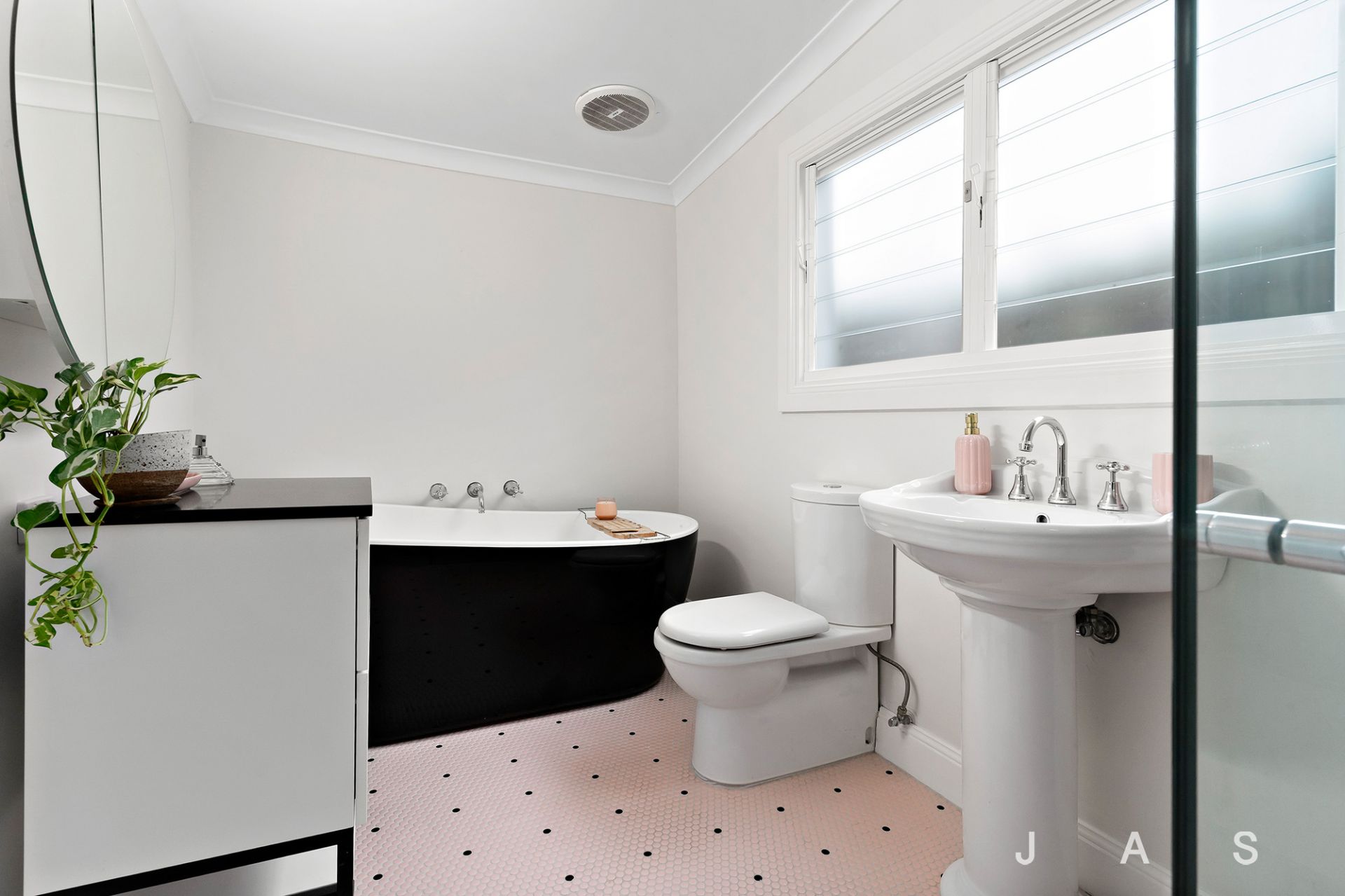 When it’s time to rest, three bedrooms offer inviting retreats, with two boasting full-width built-in robes for enviable storage. Catering to the bedrooms is the light-filled bathroom, where chic mosaic floor tiling sets the scene for everyday luxury, with a deep bathtub to sink into at the end of the day and a charming vintage vanity offering a sense of the home’s history.