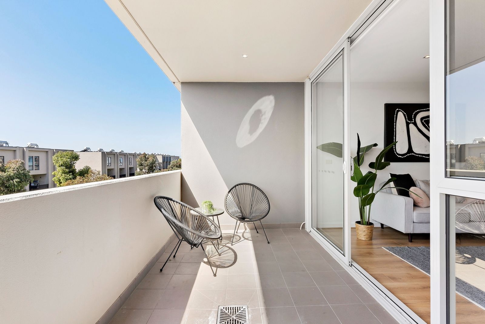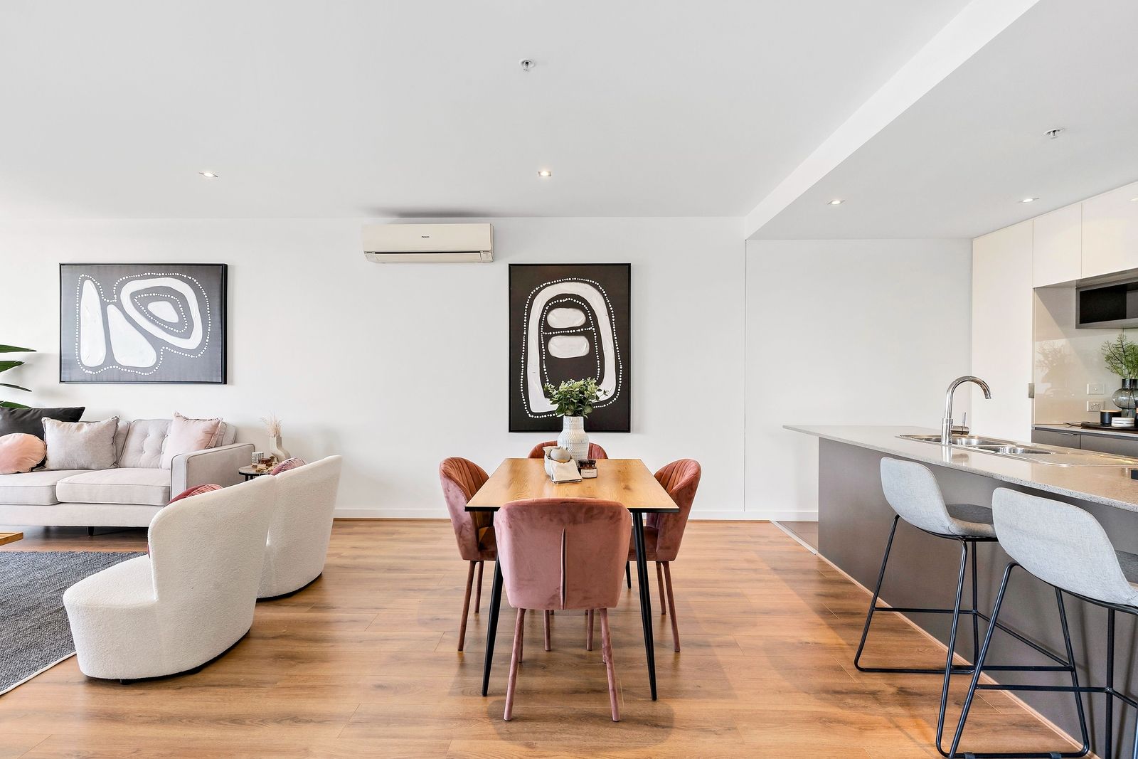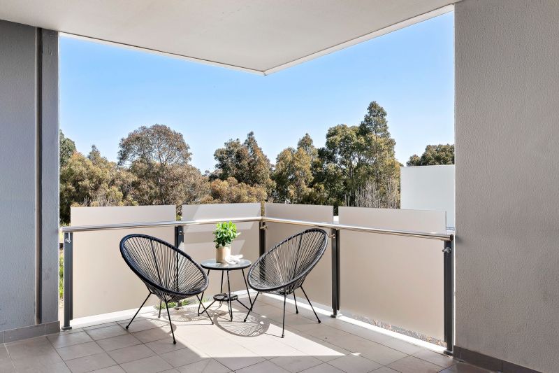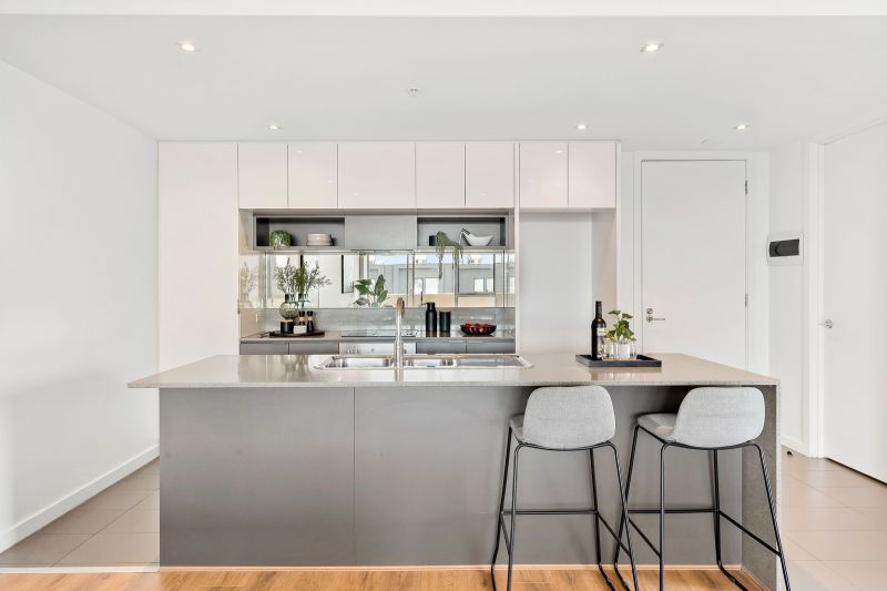 Laminate timber floorboards underscore the spacious open-plan area, where generous living and dining zones are accompanied by a stunning kitchen. A four-seater island bench boasts a waterfall stone benchtop, while quality appliances are sure to delight even the keenest of cooks. Split-system heating and cooling ensures year-round comfort while sliding doors offer an effortless connection to the balcony. Offering covered and enclosed areas, the balcony is the perfect spot for entertaining, serving up leafy treetop views as the perfect side dish to drinks with friends or your morning coffee.
