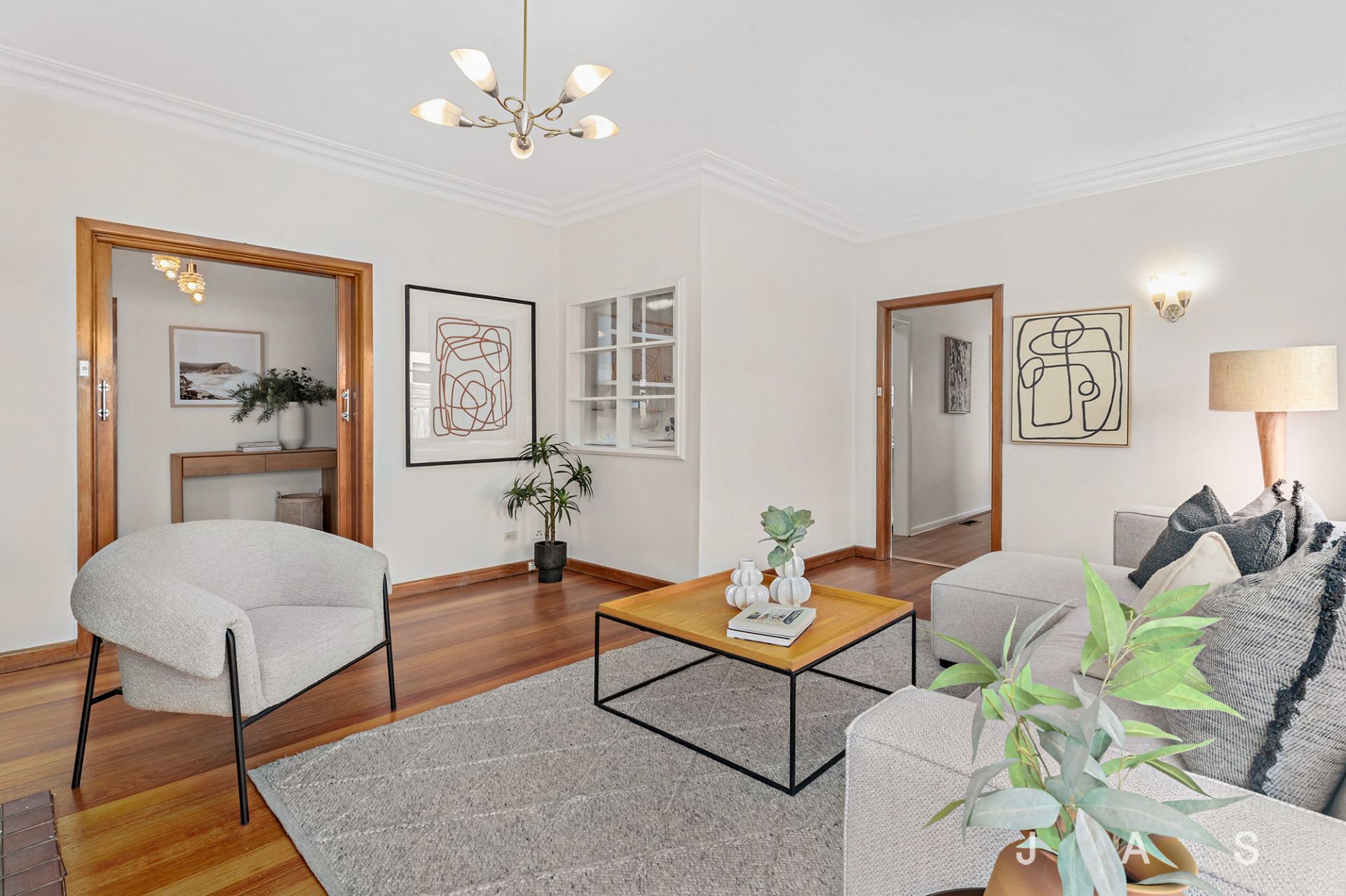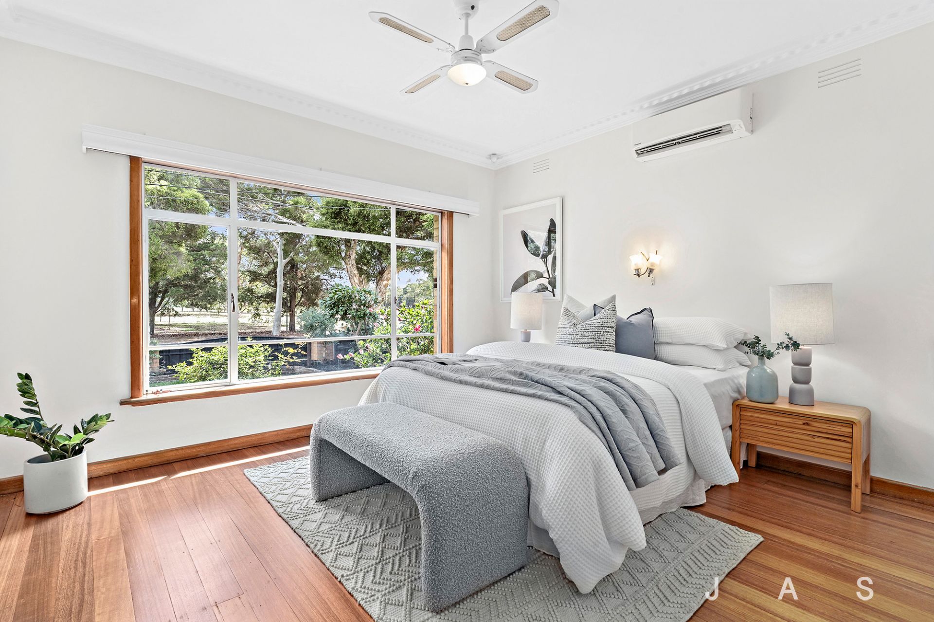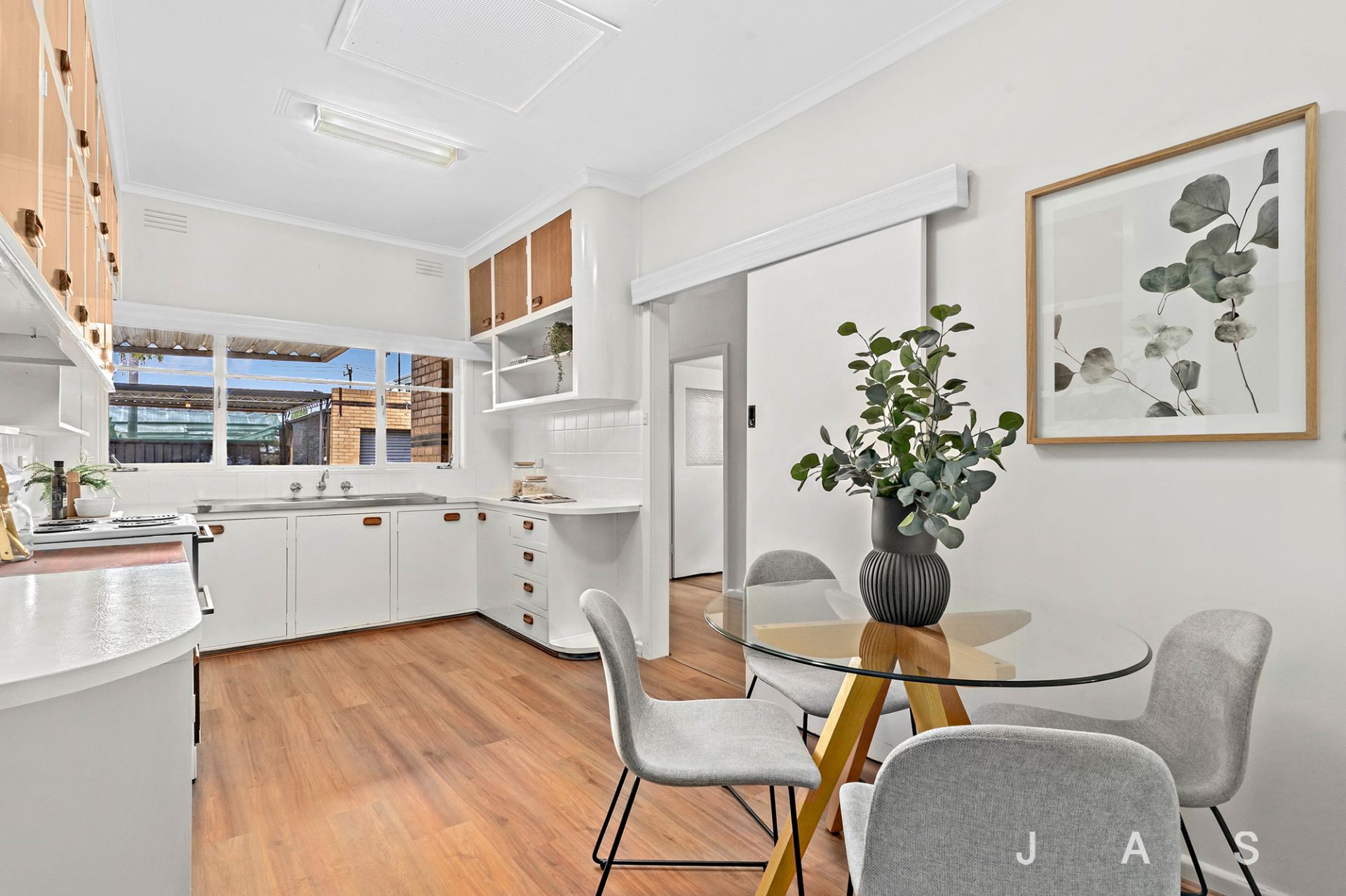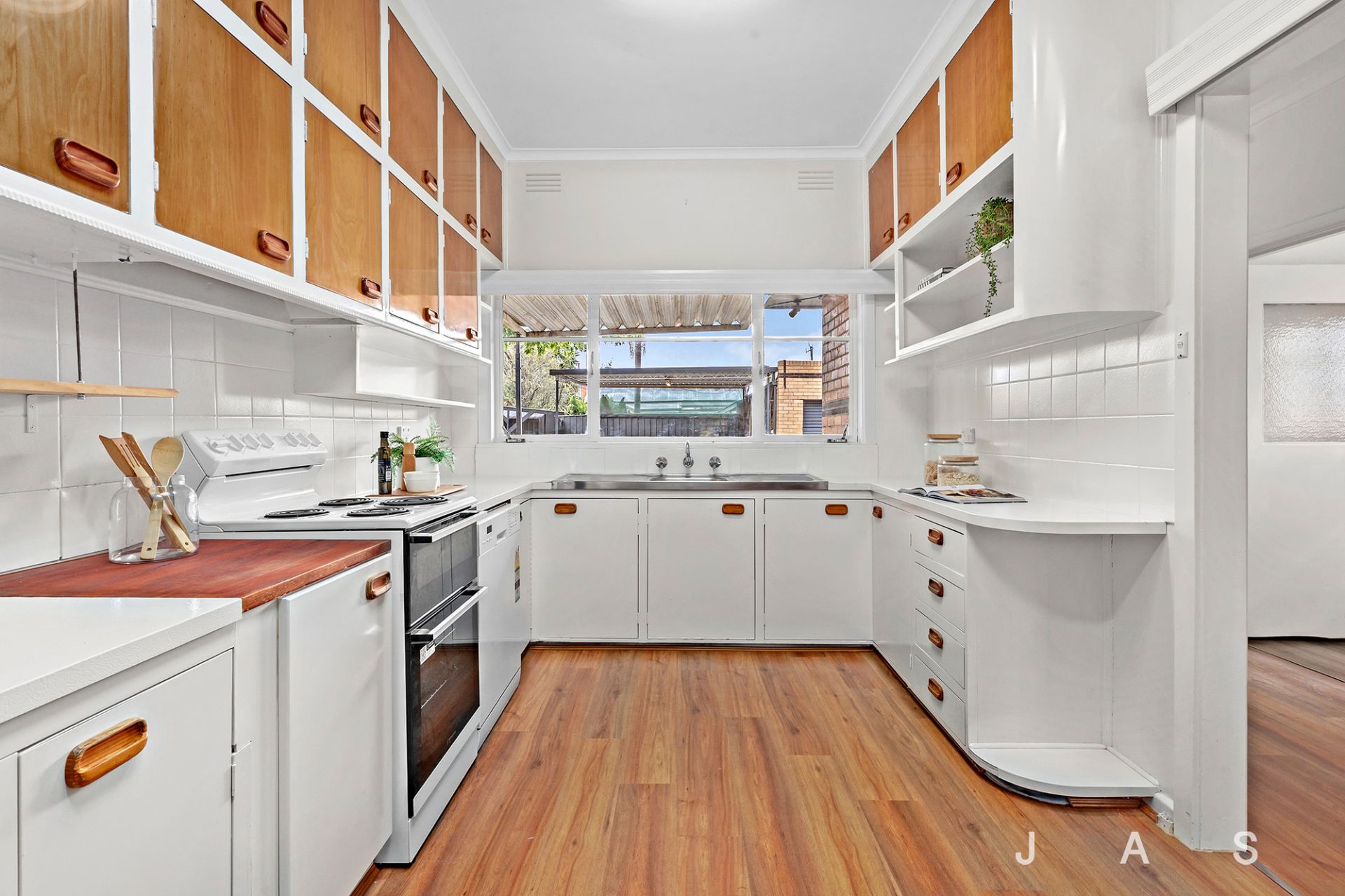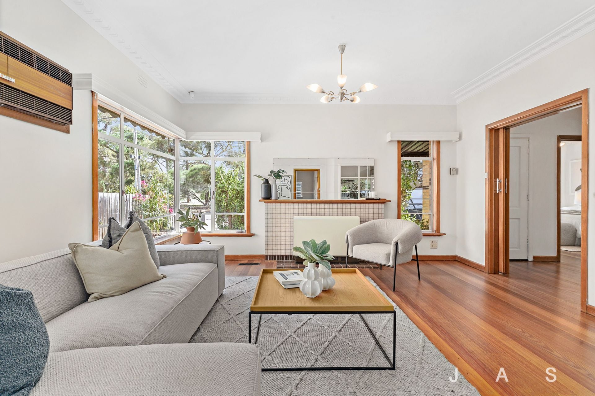 The large entry hall invites you to the spacious living room, where a huge corner window invites all-day sunshine, heating/cooling ensures your comfort and a feature fireplace offers a charming focal point. The nearby kitchen/dining room has been beautifully refreshed for instant retro appeal, with loads of bench space and storage, a dishwasher and electric cooking.