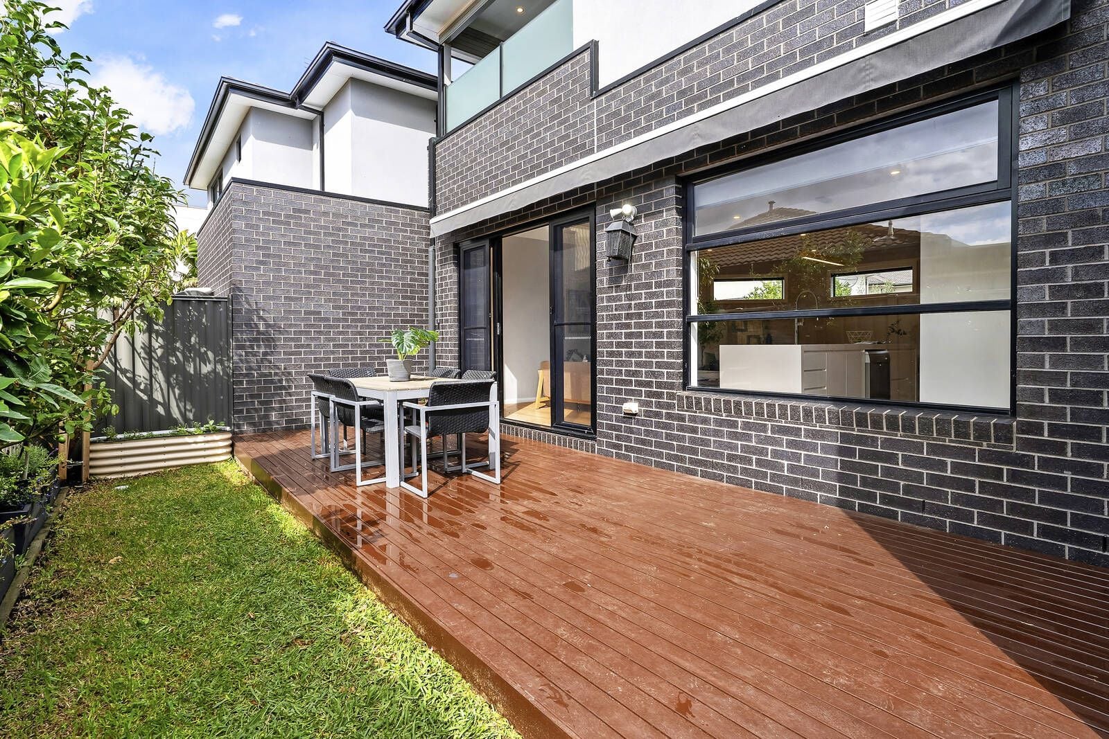 Beautiful timber boards define a living/dining area on the downstairs level that includes a kitchen where stone benches, stainless steel appliances and a butler’s pantry convey signature modern style. The presence of a bedroom and bathroom downstairs reflects the intelligence of a design that delivers equally inviting upstairs accommodation including a main bedroom with an ensuite, a third bedroom that opens to a balcony and a central study space. Decked entertaining with roll-out pergola is ideal in any season complements outdoor surroundings that feature mature fruit trees, productive vegetable patches, a secure garage and extra parking.