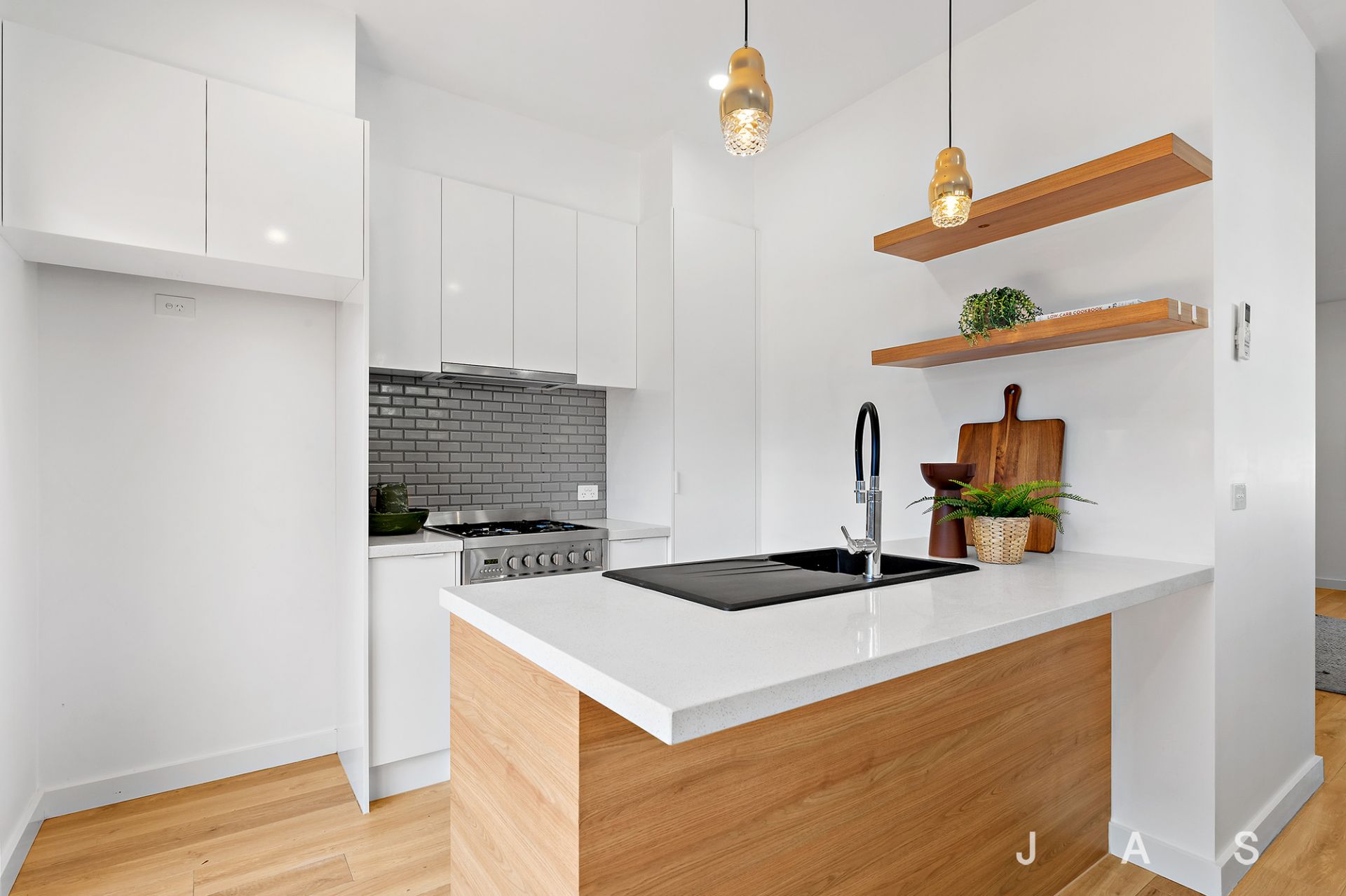 Sunny open-plan living offers plenty of room to relax and entertain, with a large living space joined by a beautifully appointed kitchen with stone benchtops, timber accents, a pendant-lit breakfast bar and plenty of space for a dining table to gather family and friends around.