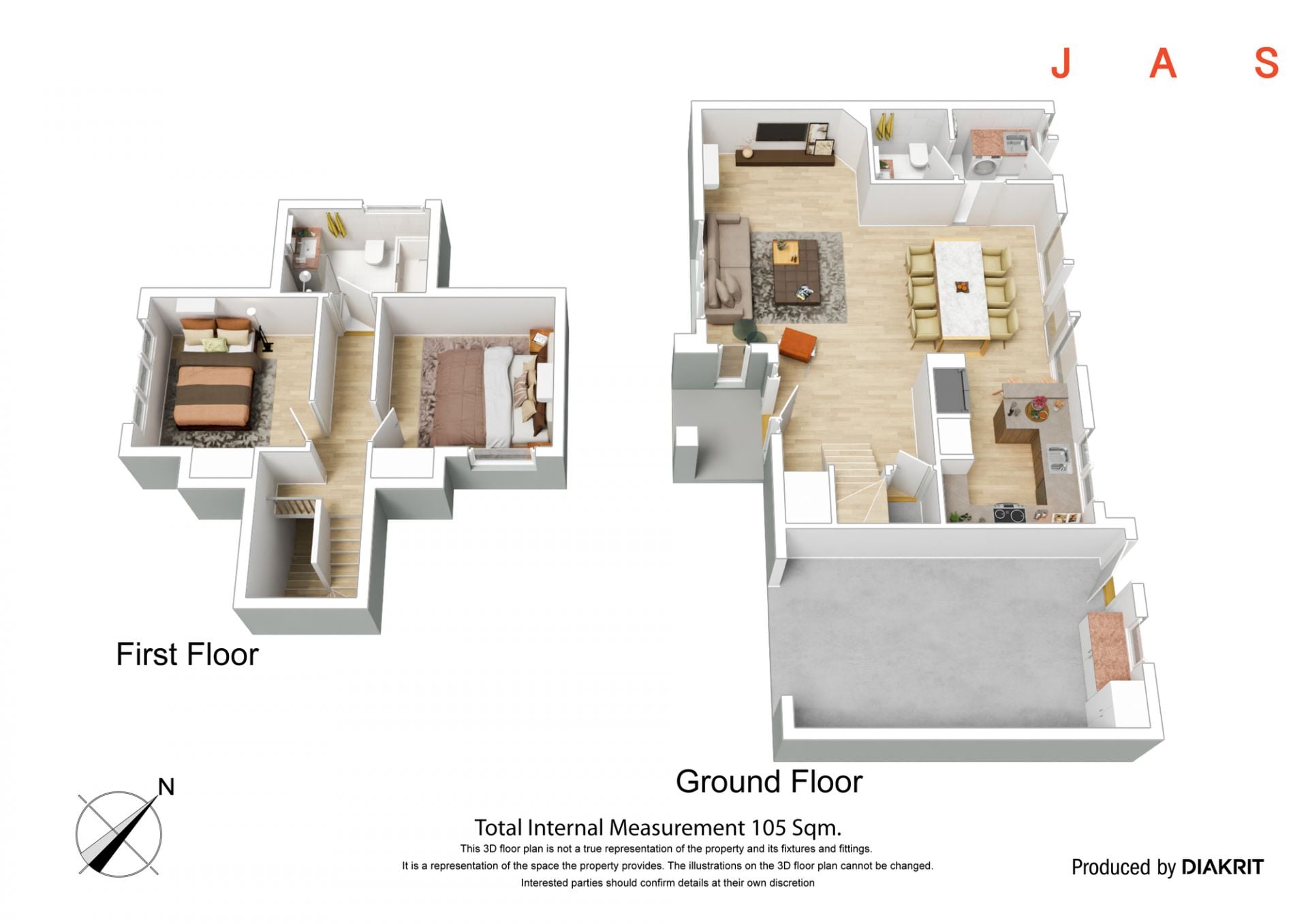 On the upper level, two bedrooms with built-in robes are served by the centrally positioned bathroom with shower and inset bathtub, while downstairs an oversized open-plan living space offers generous dining and lounge zones and a well-appointed kitchen.
