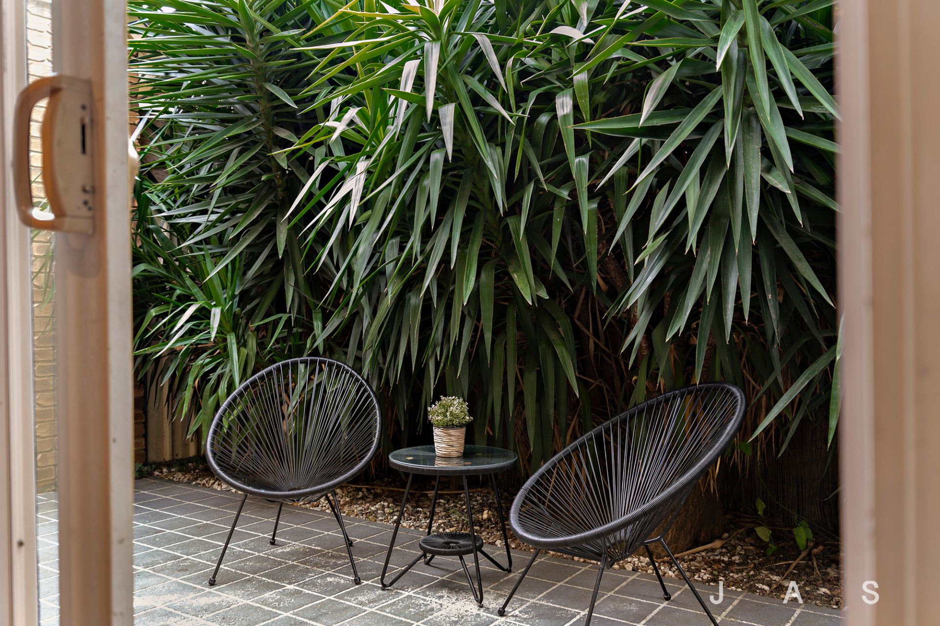 • Low-maintenance courtyard garden with leafy screening for privacy