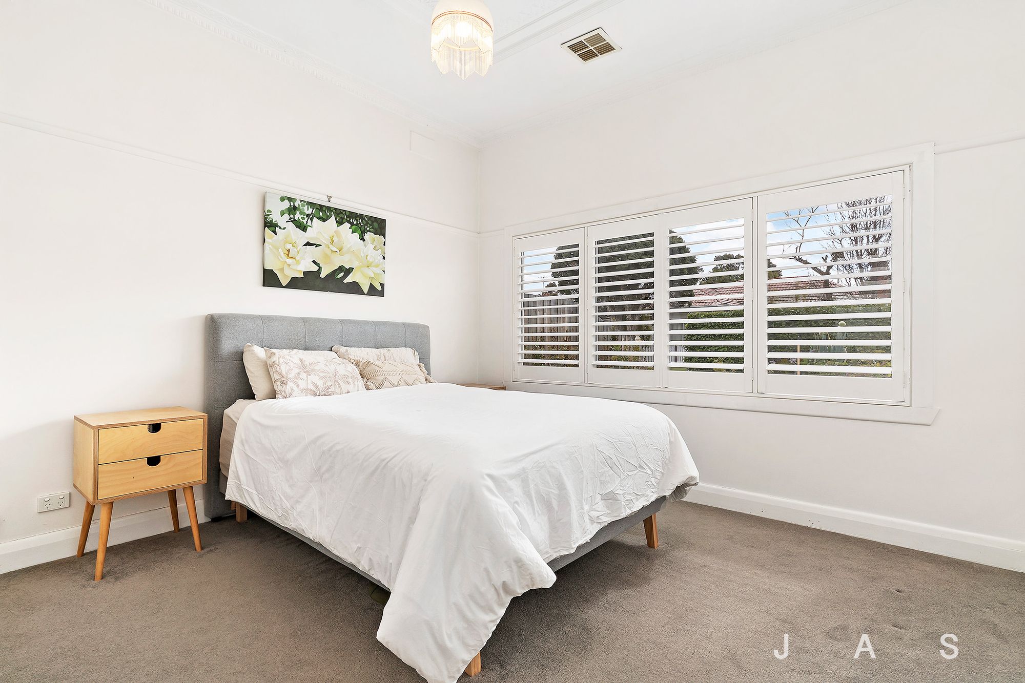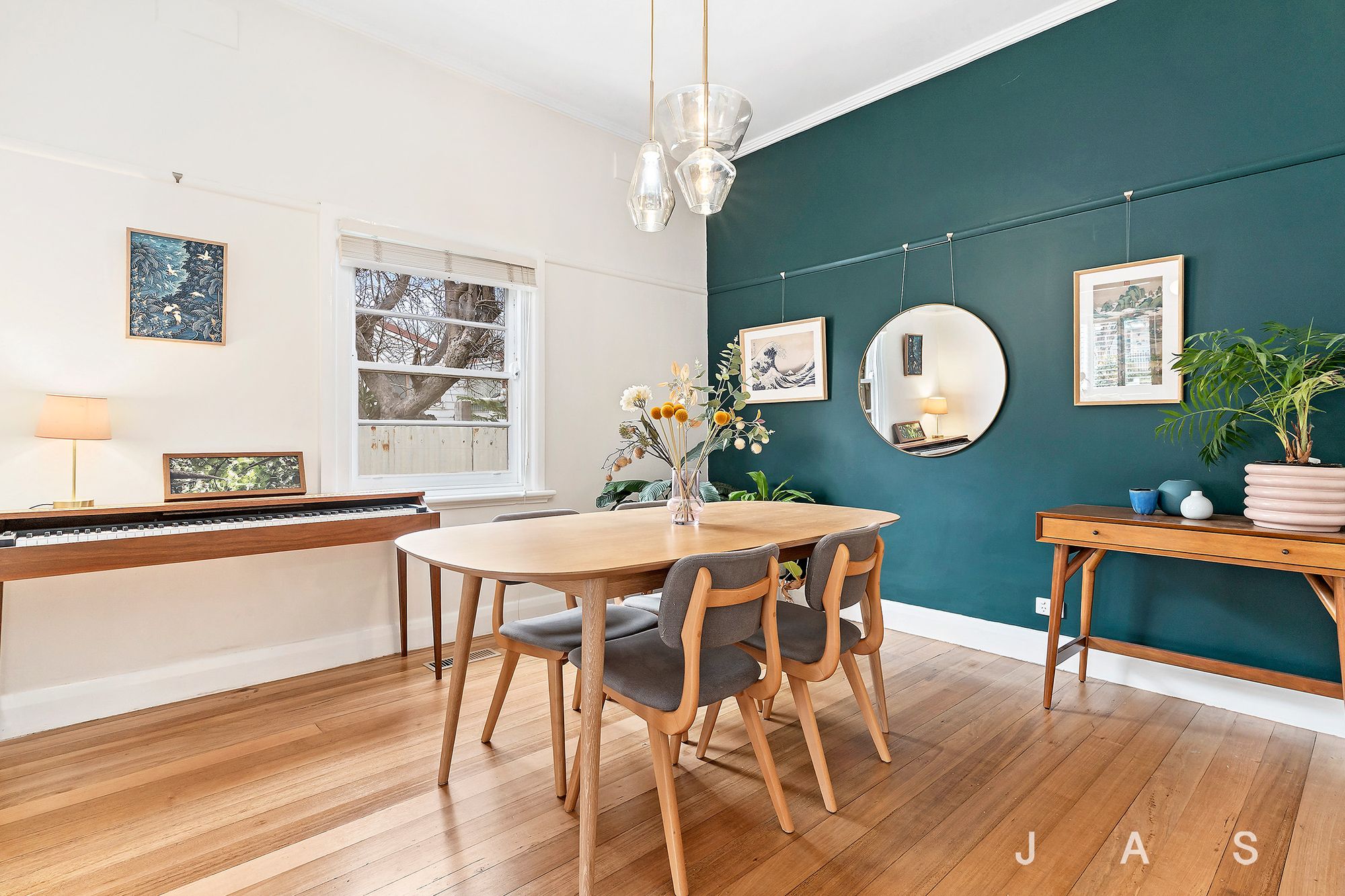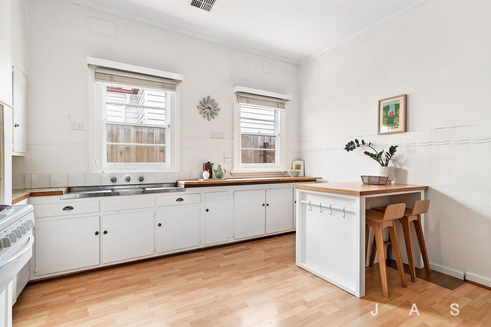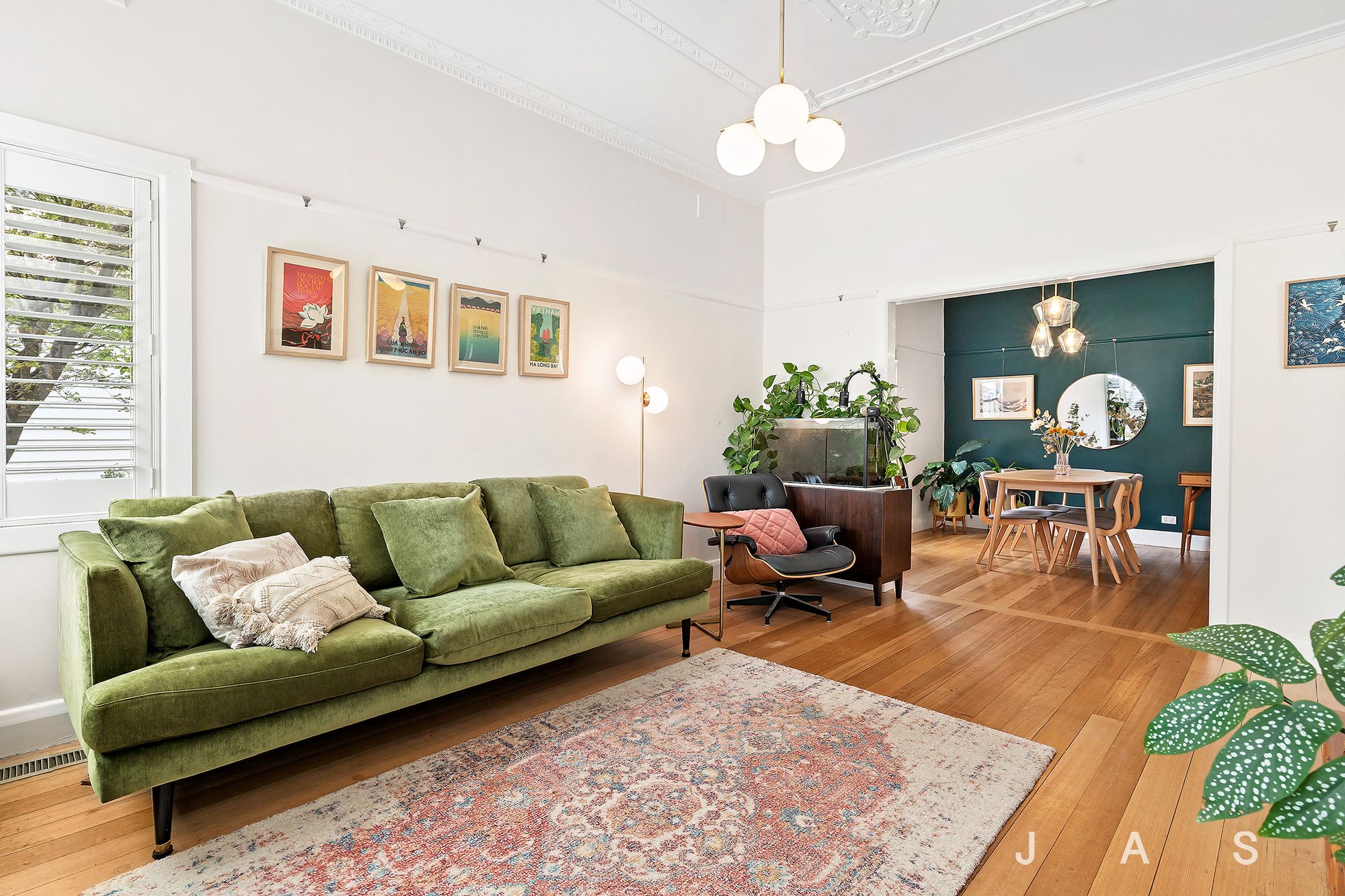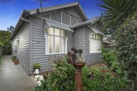 Behind a white-picket fence, manicured box hedge and front garden with room for a car securely off-street, an inviting interior promotes comfort from the outset courtesy of a tasteful transformation, while details in hardwood floors, picture rails, sash windows and high, Art Deco-style ceilings work to accentuate period appeal. Excellent robe space and a chic bathroom with large-format tiles from floor to ceiling and a timber-and-stone vanity serve substantial main and guest bedrooms, while a central dining room doubles as a third bedroom to cater for the growing family.