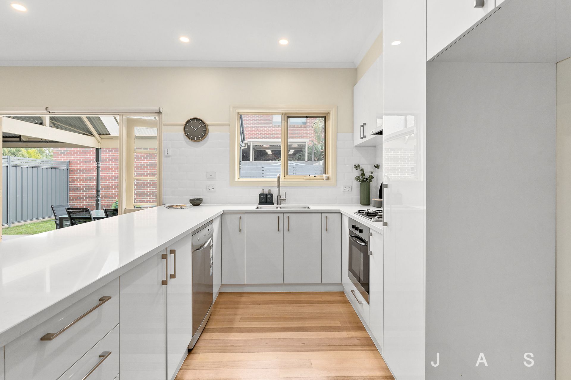 The lower level delivers sunny open plan living, with timber floorboards sweeping through generous living and dining zones to the well-appointed kitchen with stone benchtops, stainless steel appliances and a breakfast bar ideal for casual dining. French doors invite you to dine and entertain alfresco on the covered patio/carport, with the neat back garden beyond providing a safe outdoor play space for the kids to enjoy.