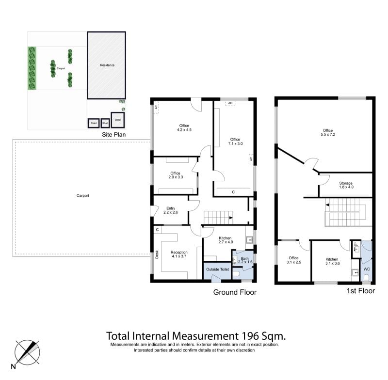 The current double-story structure comprises a large reception space, five offices of varying sizes, two kitchen areas and two toilets. Outside a large carport provides covered parking, two sheds offer extra storage and a third toilet adds convenience.