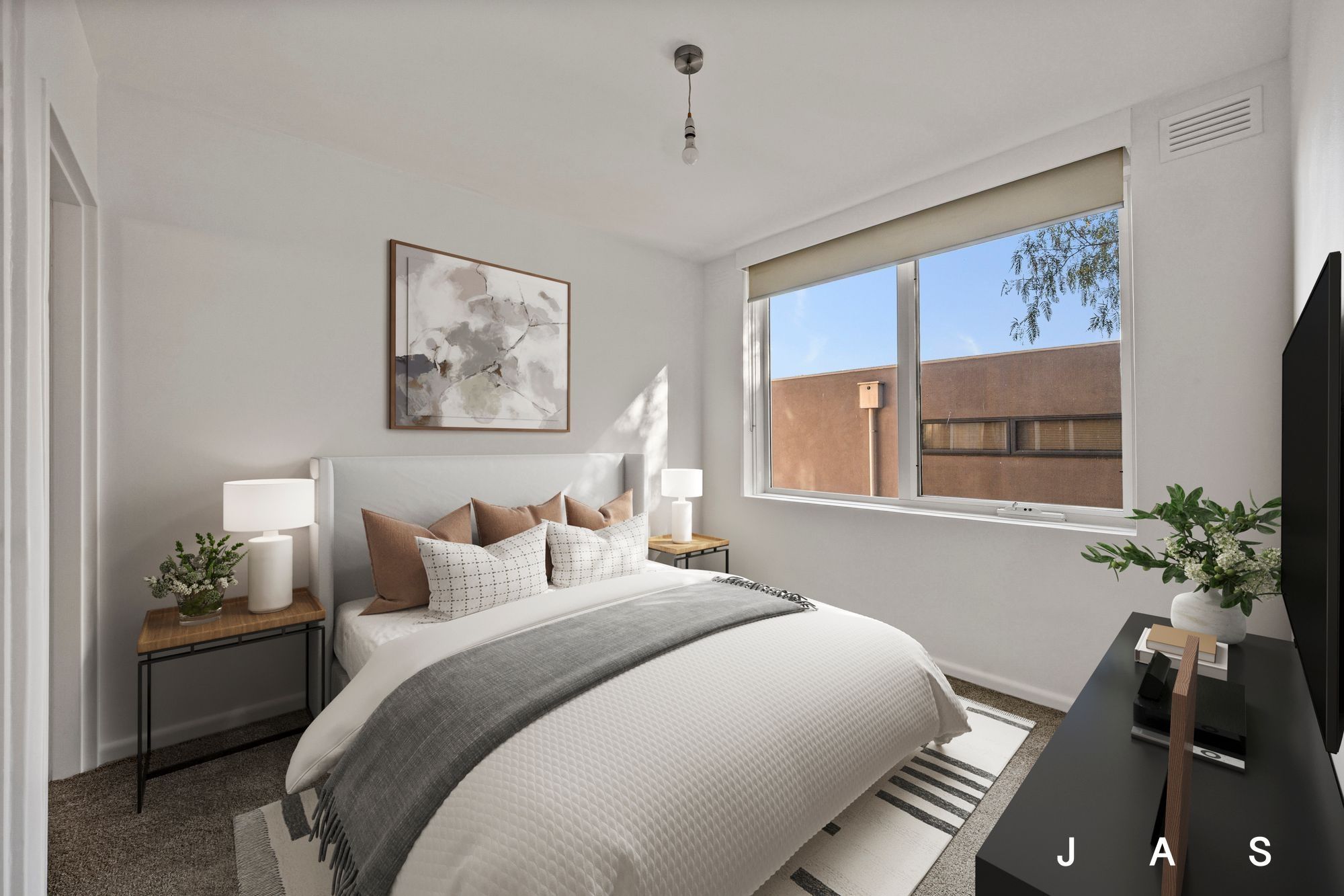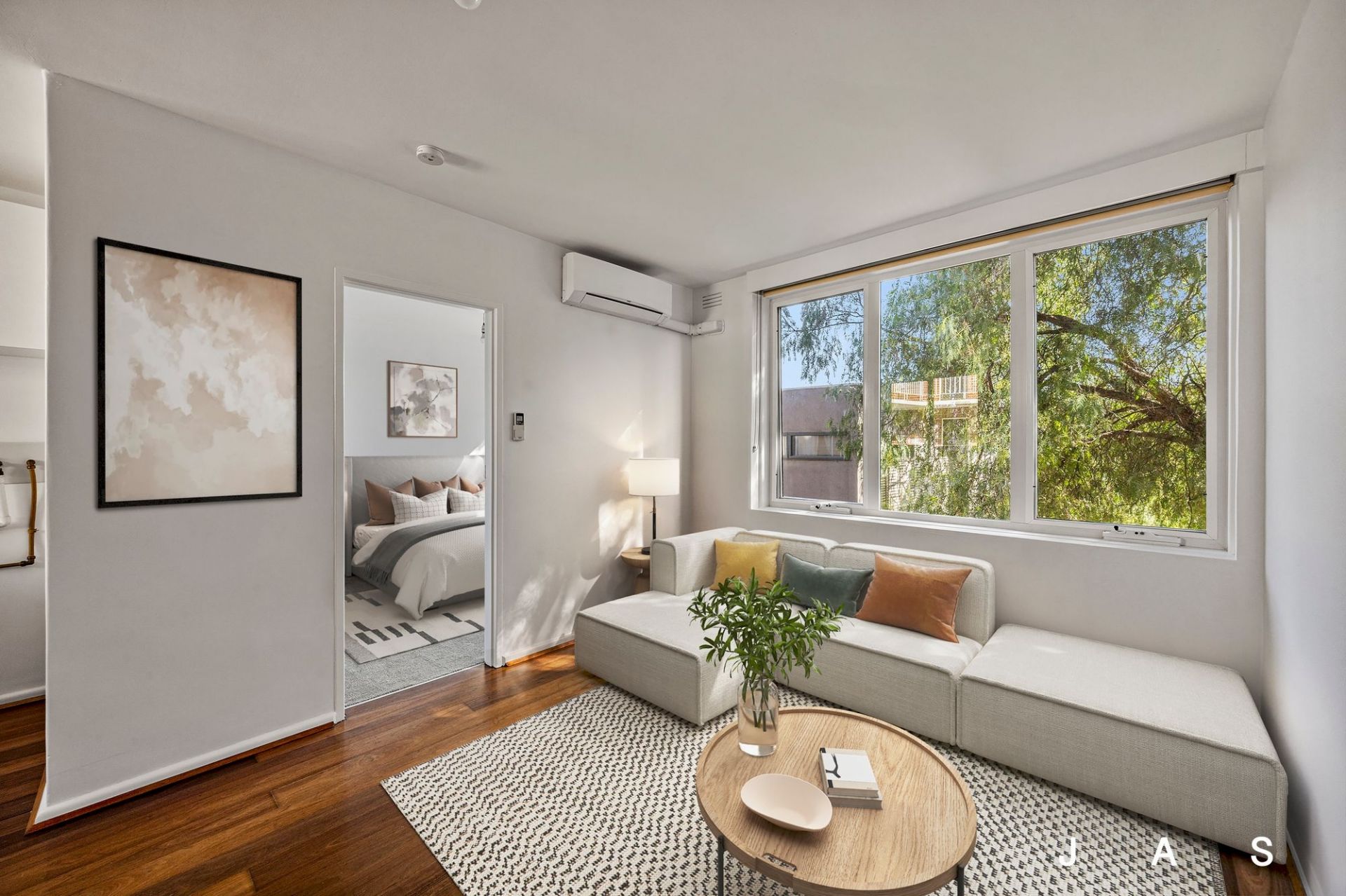 Light-filled open plan living offers kitchen, dining and lounge zones underscored by timber floorboards and elevated by leafy treetop views. The bedroom boasts two built-in robes and an updated ensuite, while split-system heating/cooling, inviting communal gardens and allocated off-street parking add loads of appeal to this move-in-ready home.