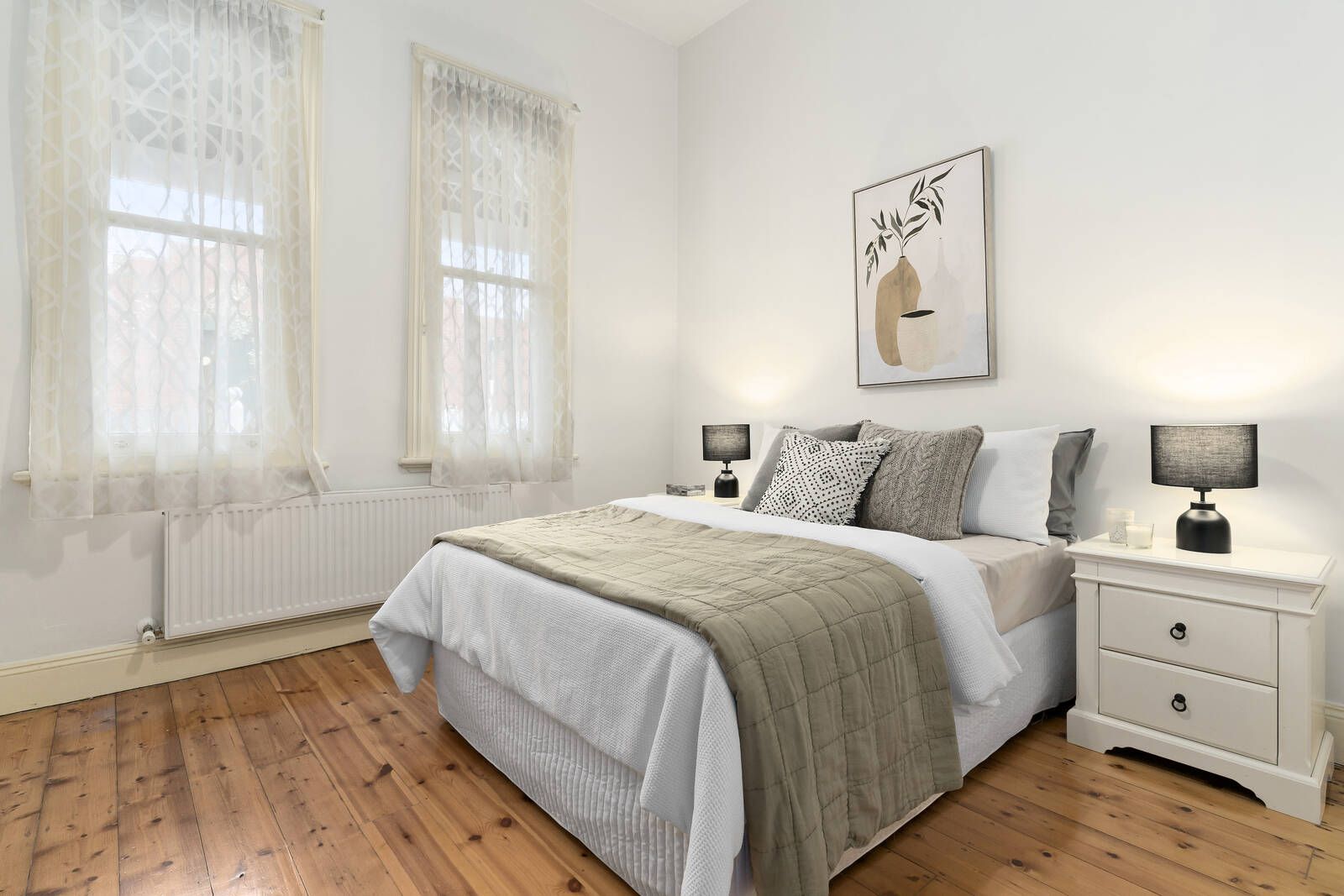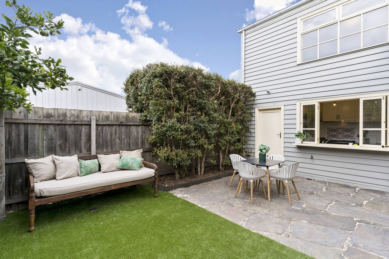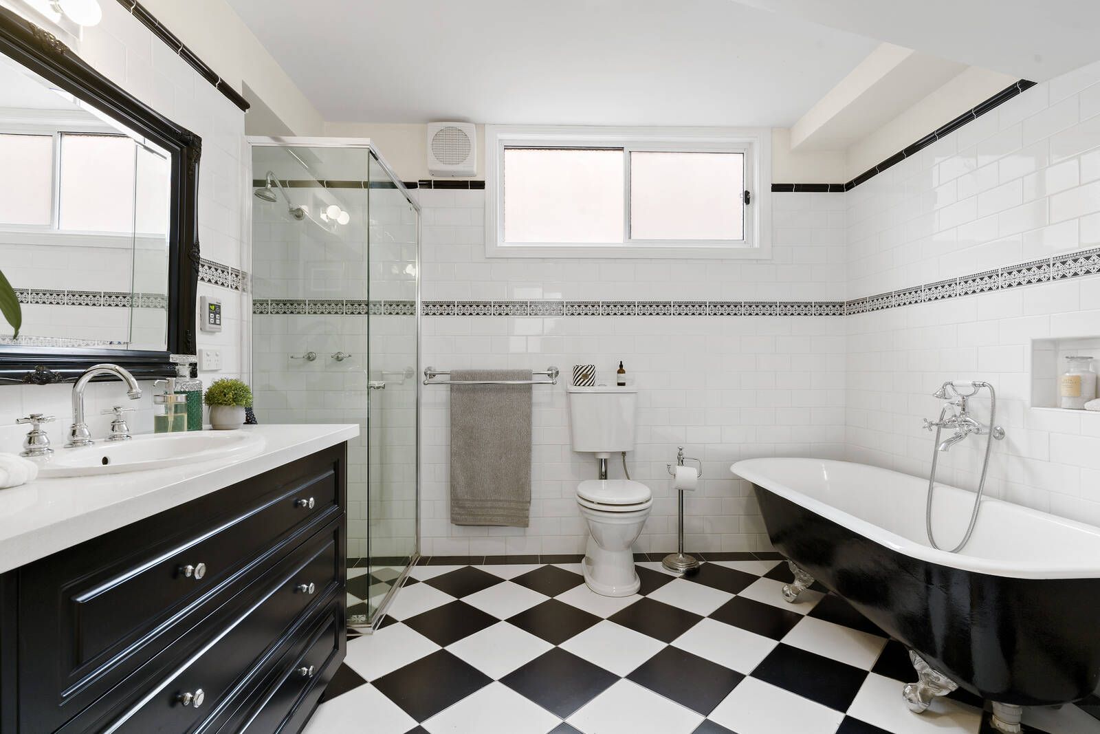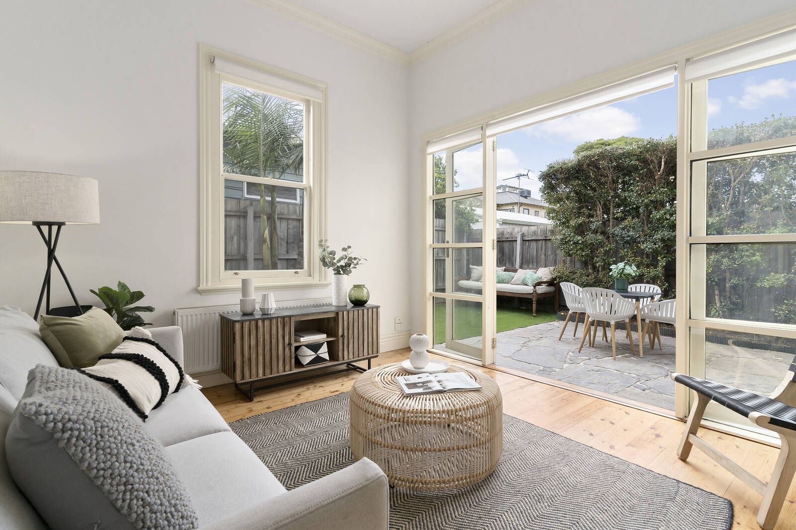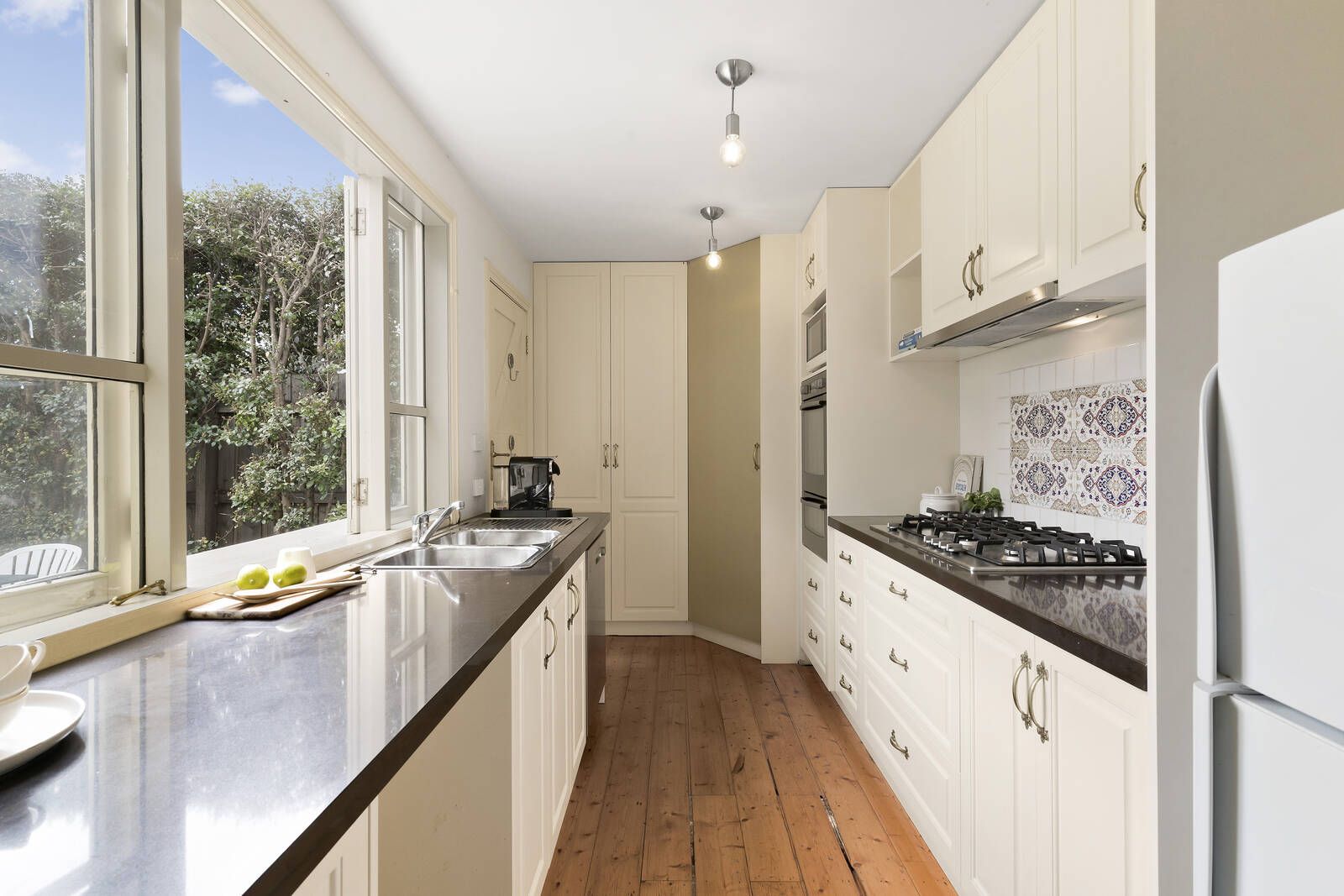 The façade’s charm introduces a series of inviting spaces including three double bedrooms and two bathrooms, including a main bathroom where fabulous black and white tones and a cool classic claw foot bath deliver delights every day and night while the main bedroom and ensuite enjoy an upstairs zone of their own.