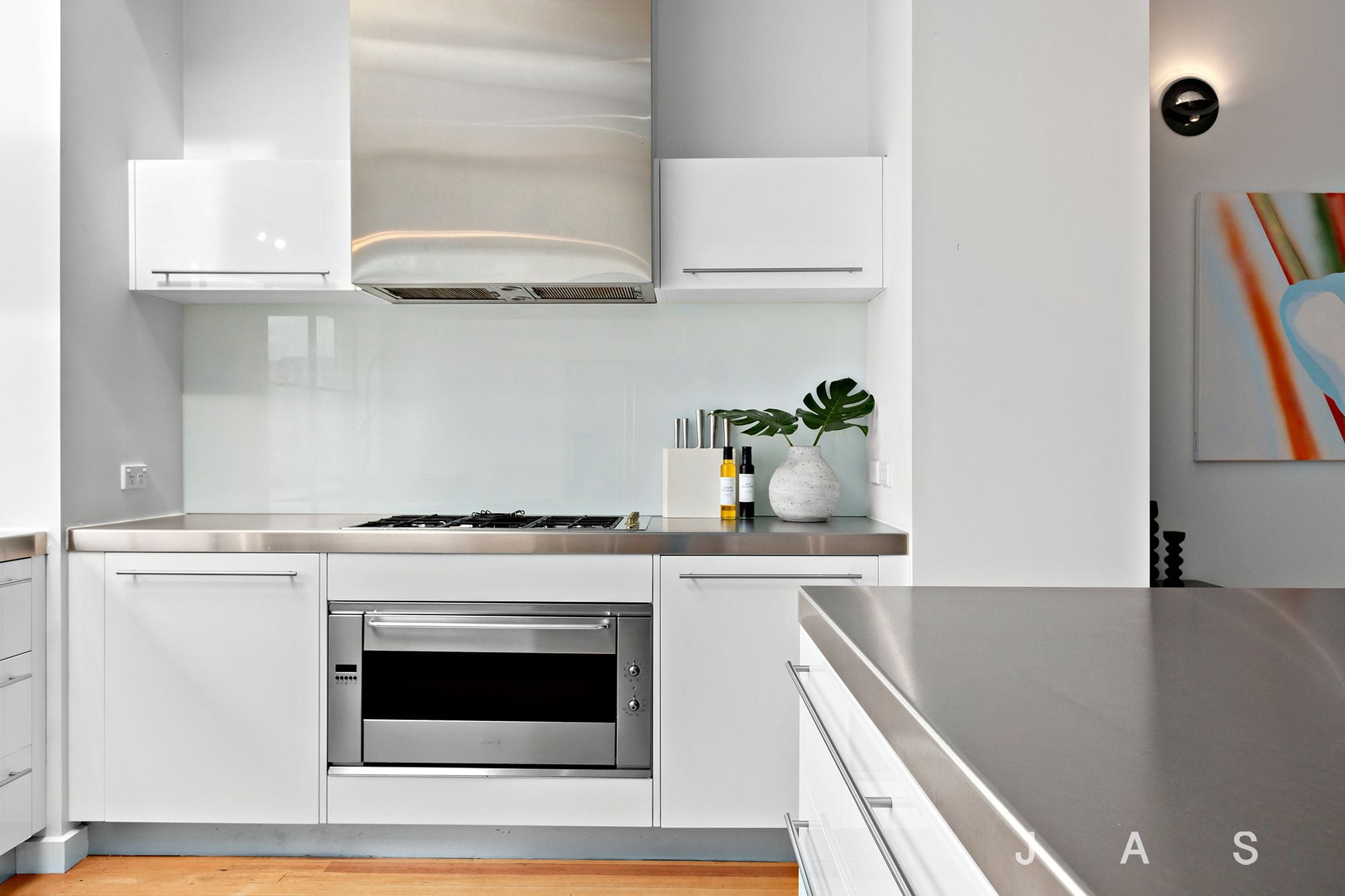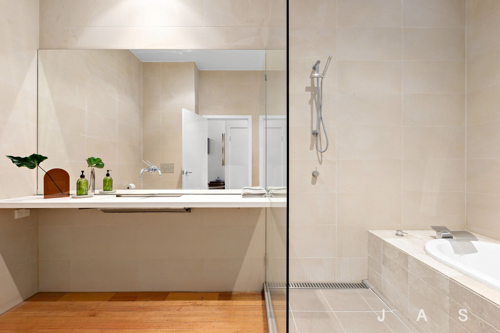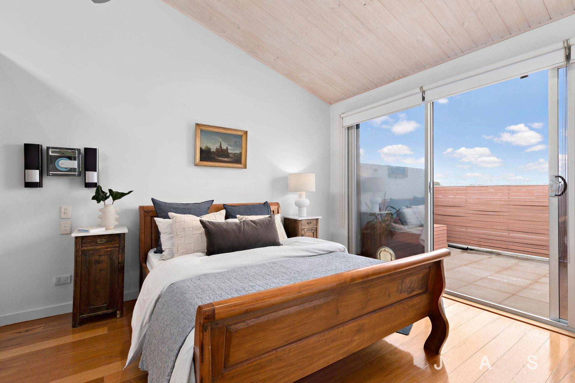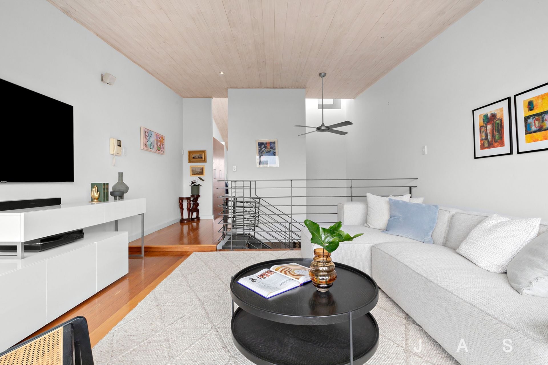 The master bedroom is elevated by a huge walk-in robe, an ensuite and a private balcony, while the second bedroom enjoys twin built-in robes and next-door access to the luxe main bathroom, where floor-to-ceiling tiling sets the scene for everyday luxury. A third bedroom is made possible by the large studio level, where a kitchenette provides convenience and steel-clad walls and exposed beams create a superb aesthetic.