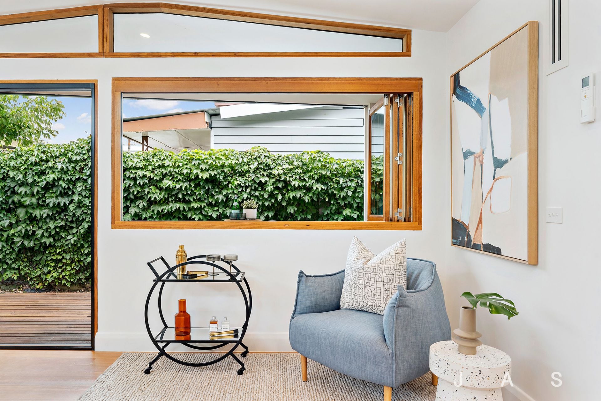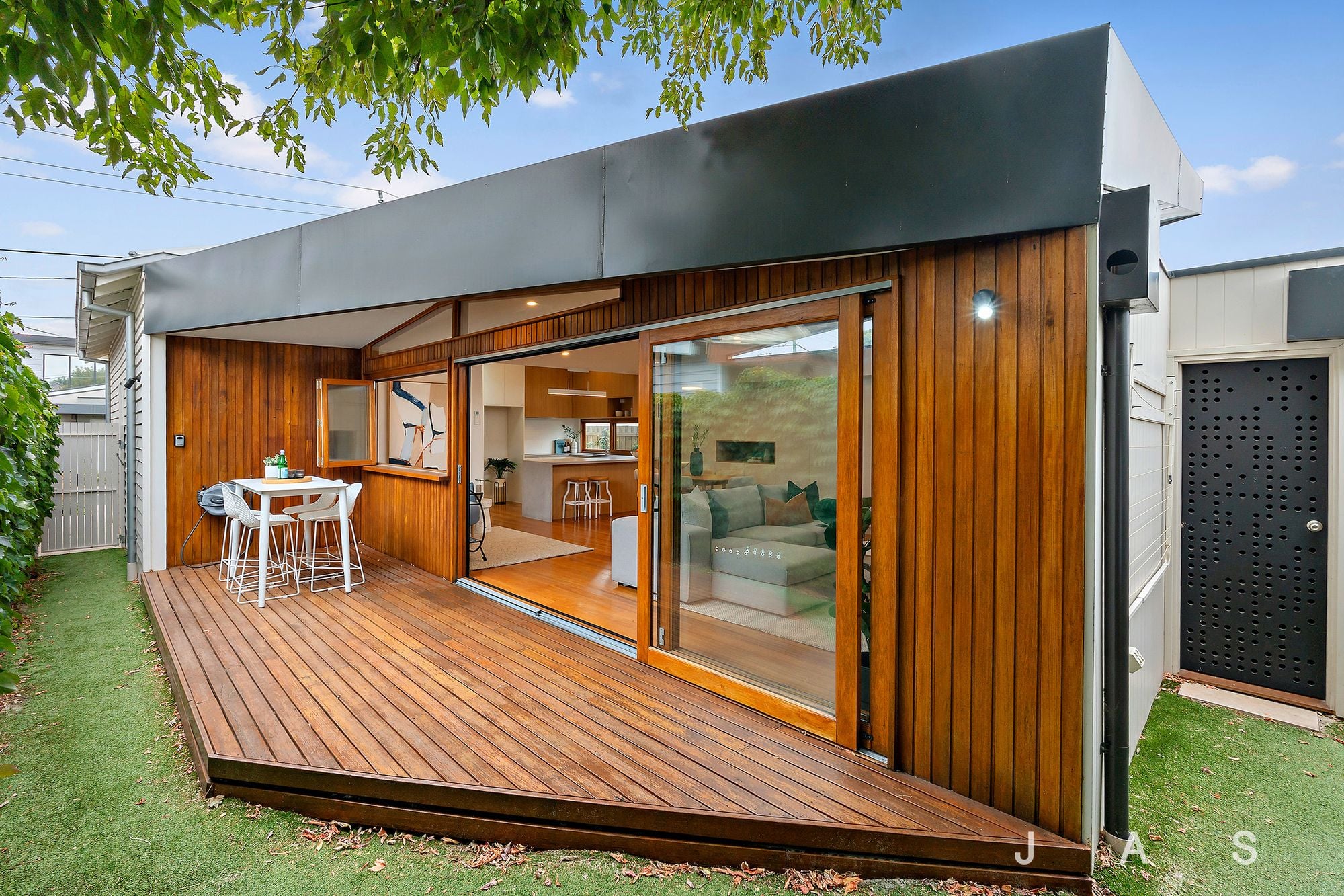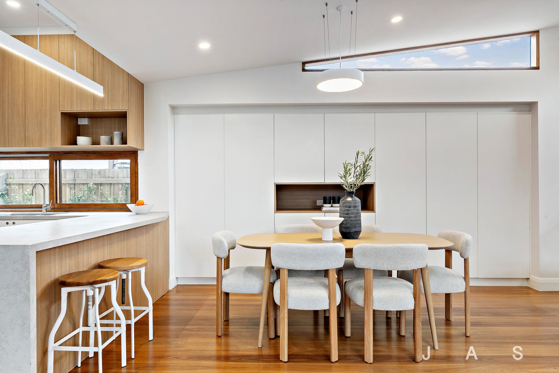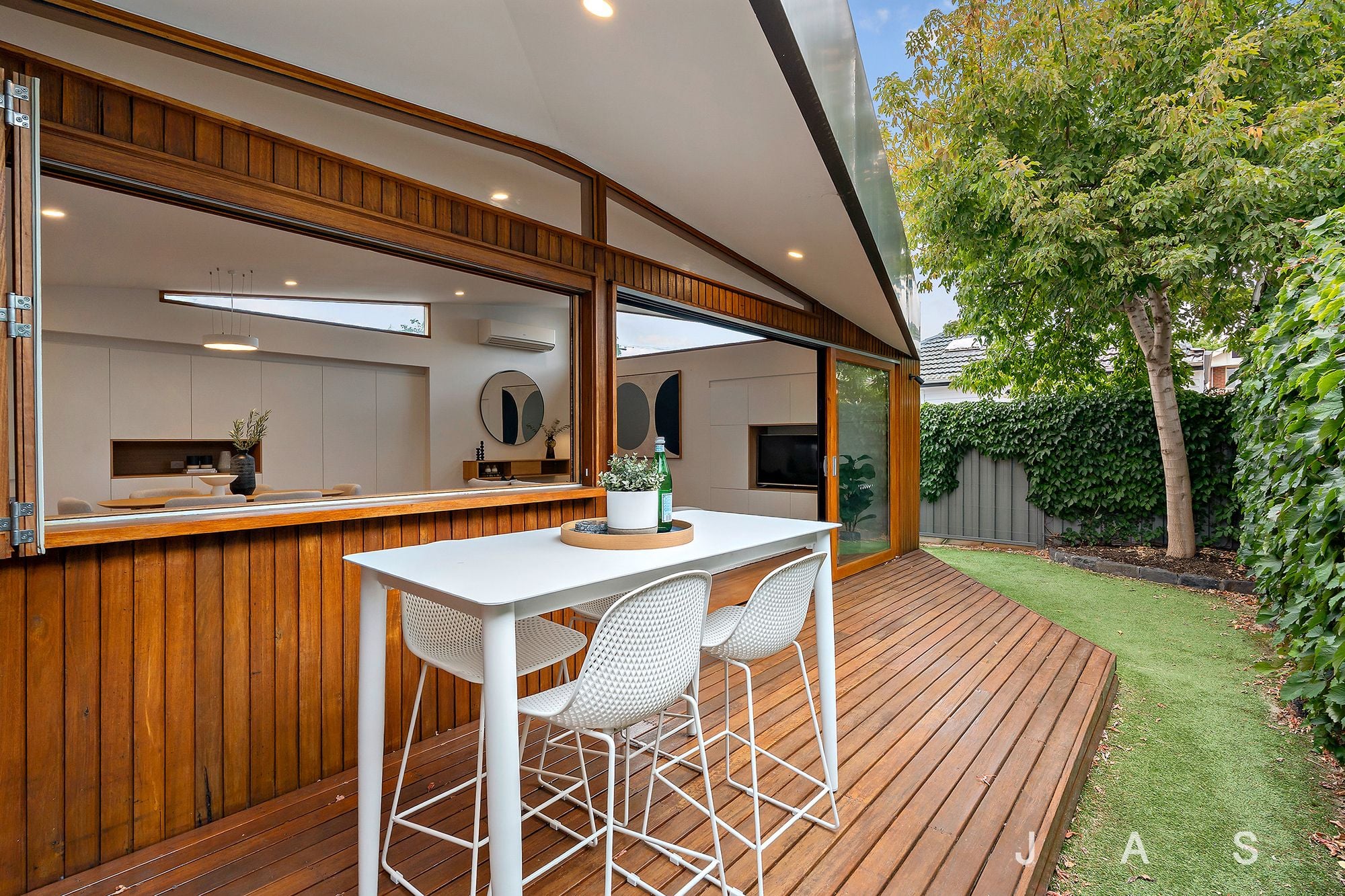 A servery window and sliding glass doors extend the open-plan area out to the large, north-facing deck and low-maintenance garden, allowing for effortless alfresco dining and entertaining