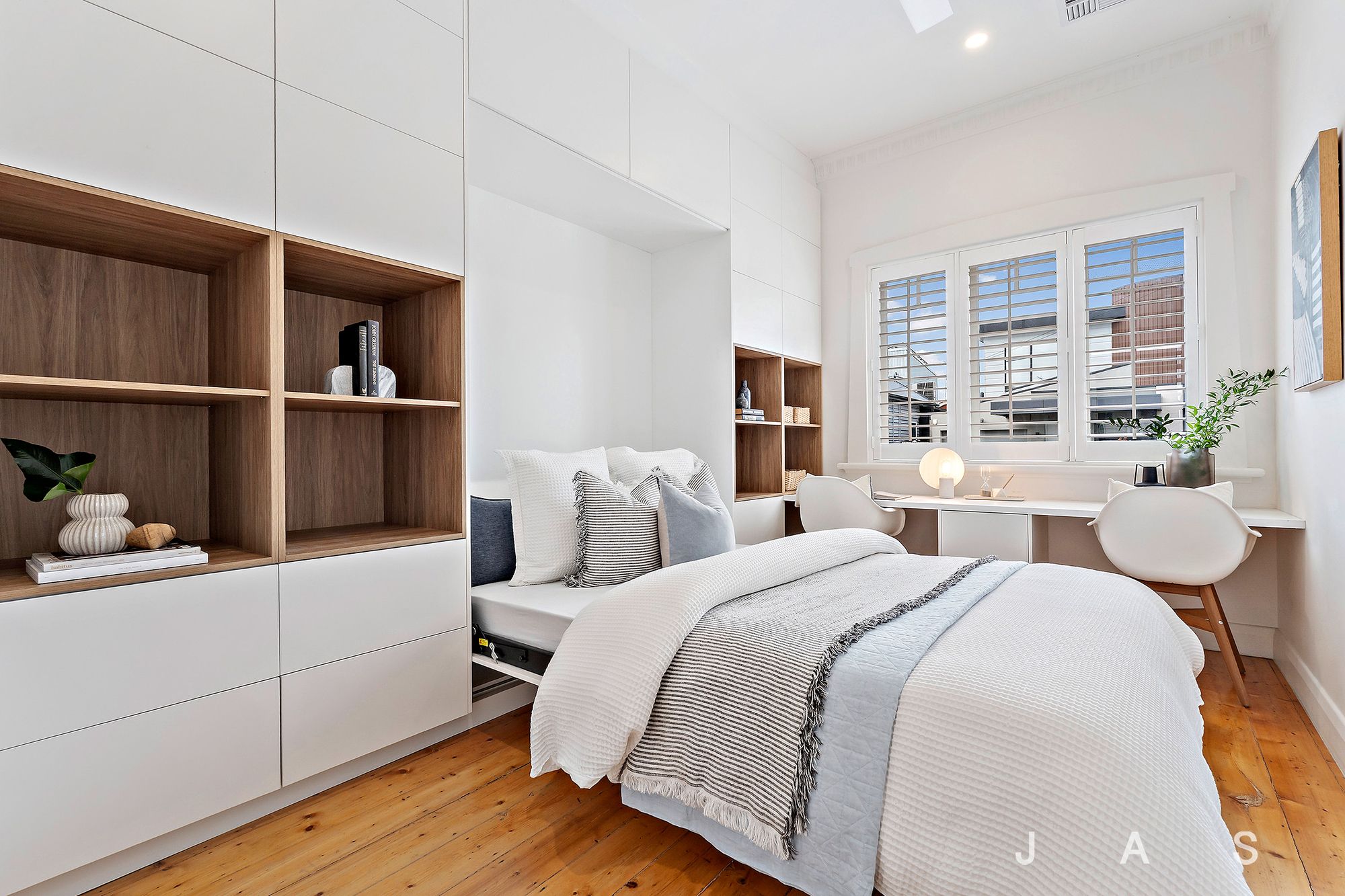 • Third bedroom with in-built desk and chic storage cabinetry + discreet, fold-down Murphy bed