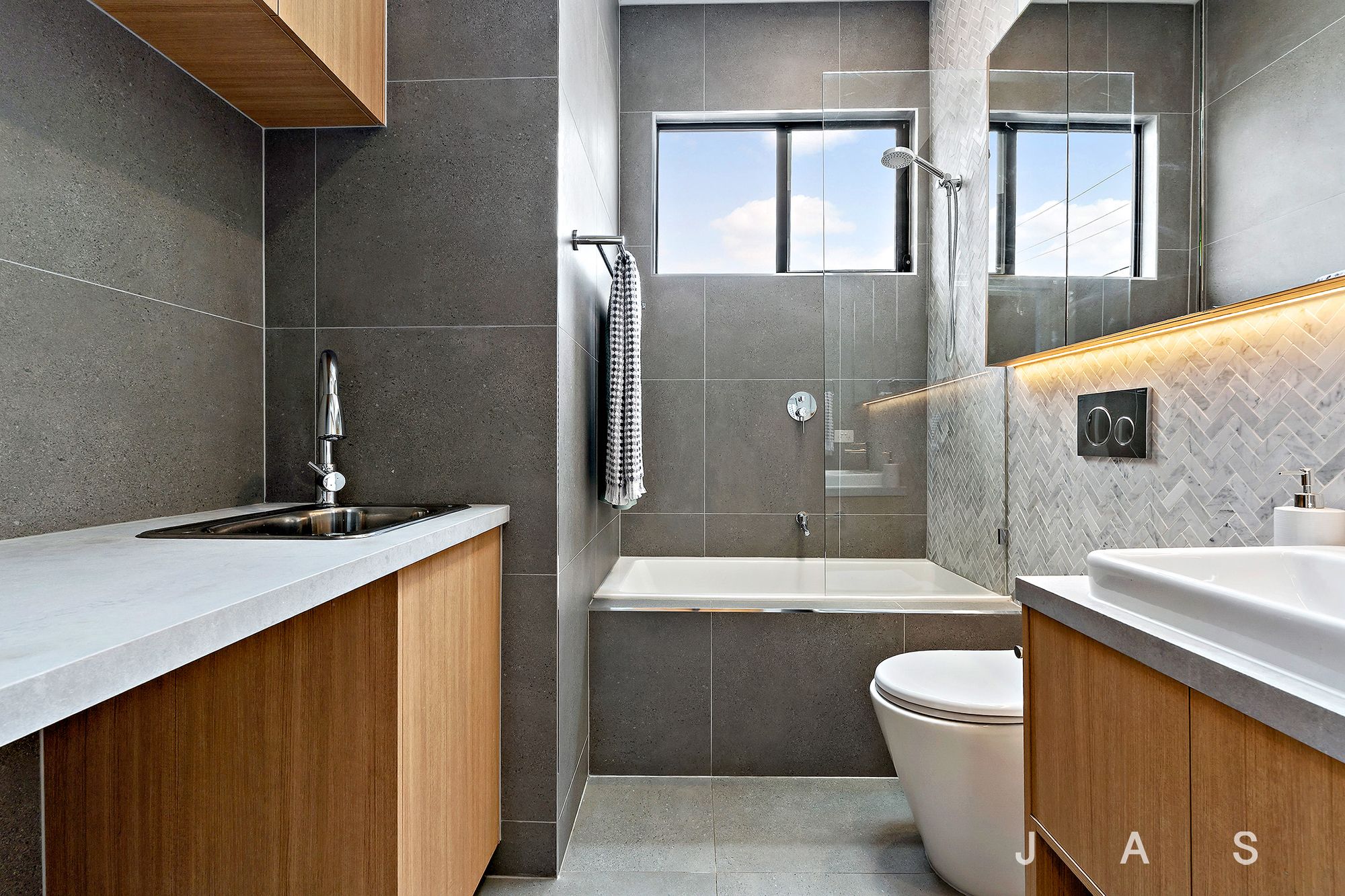 • Main bathroom with floor-to-ceiling tiling and shower-over-bath + incorporated laundry facilities
