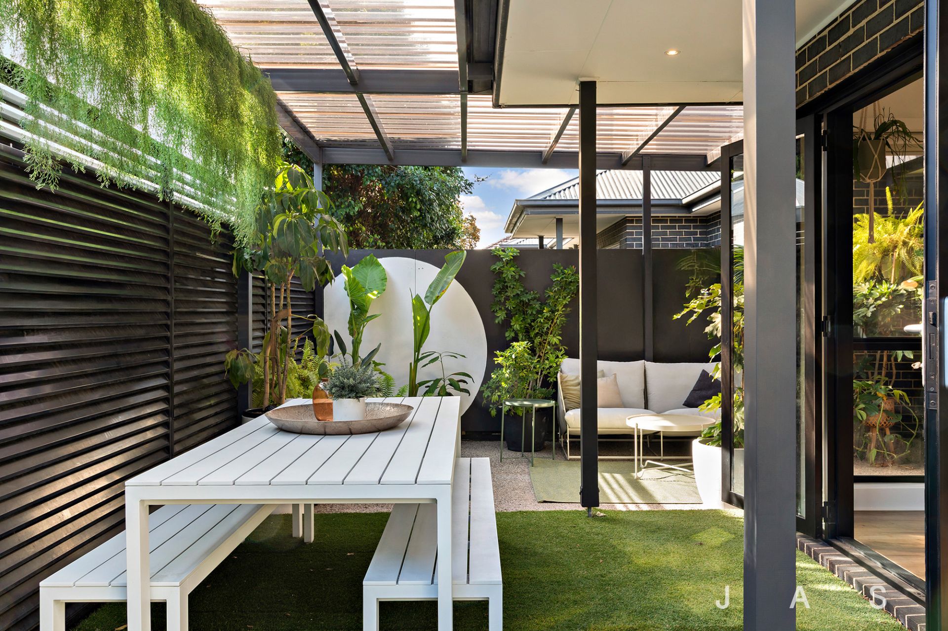Extending the living space is the wraparound entertainer’s garden, where low-maintenance outdoor living is a dream and year-round alfresco dining is made possible by an inviting covered section.