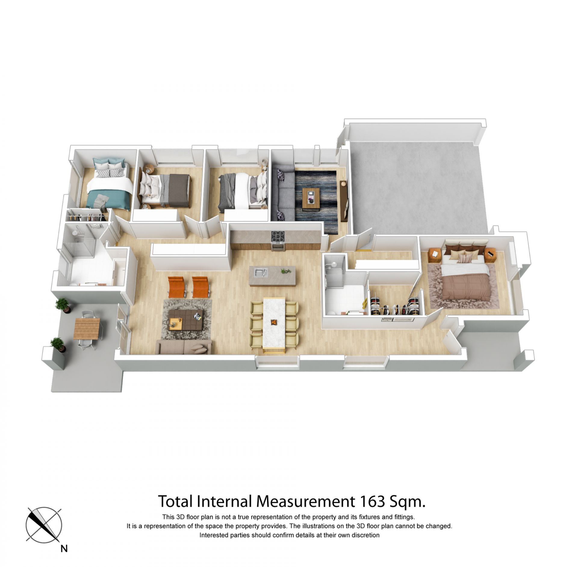 The huge master bedroom is complemented by an oversized walk-in robe and a private ensuite, while the three additional bedrooms—all appointed with built-in robes—are served by the second bathroom, where a bath and separate shower await.