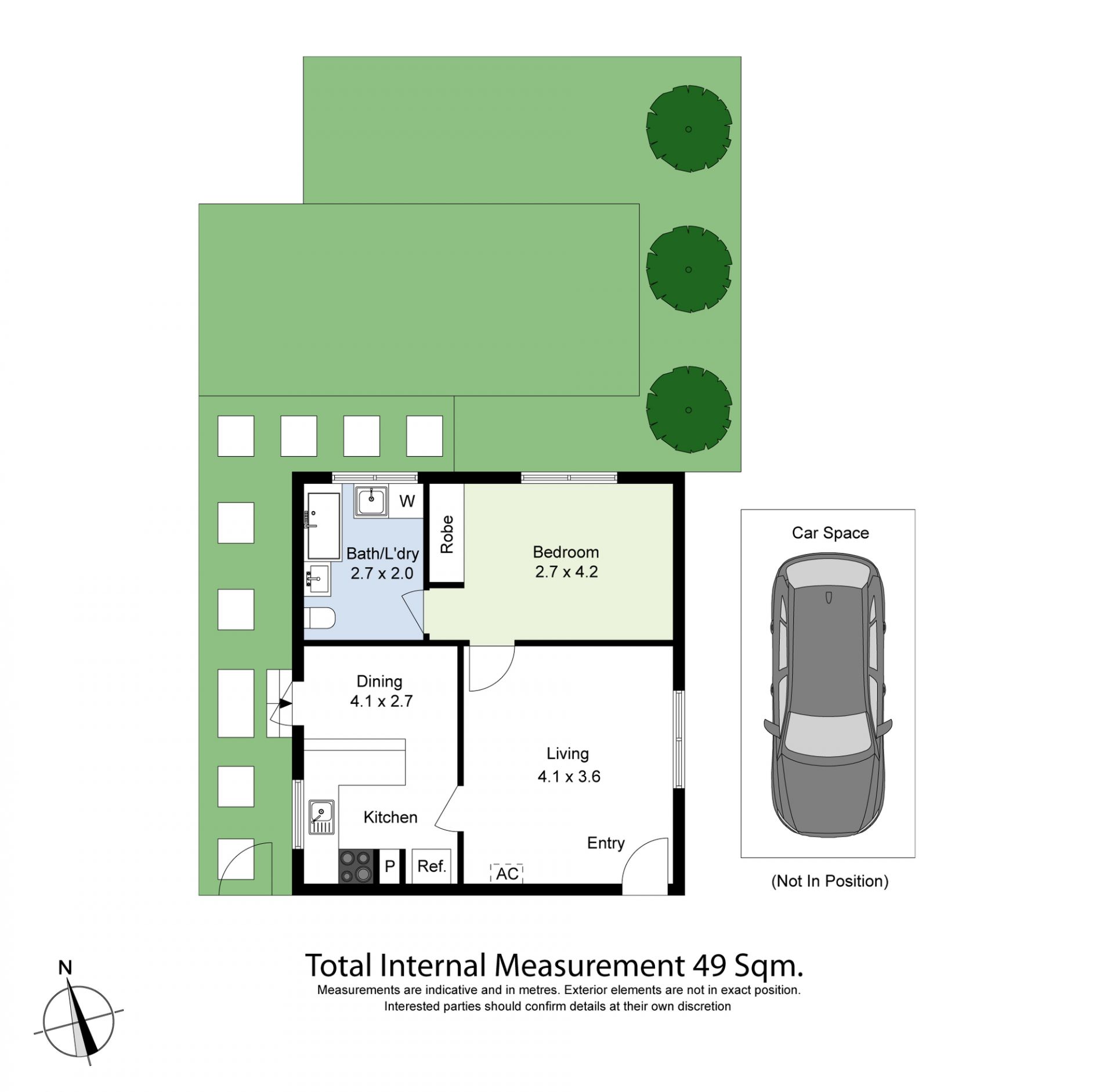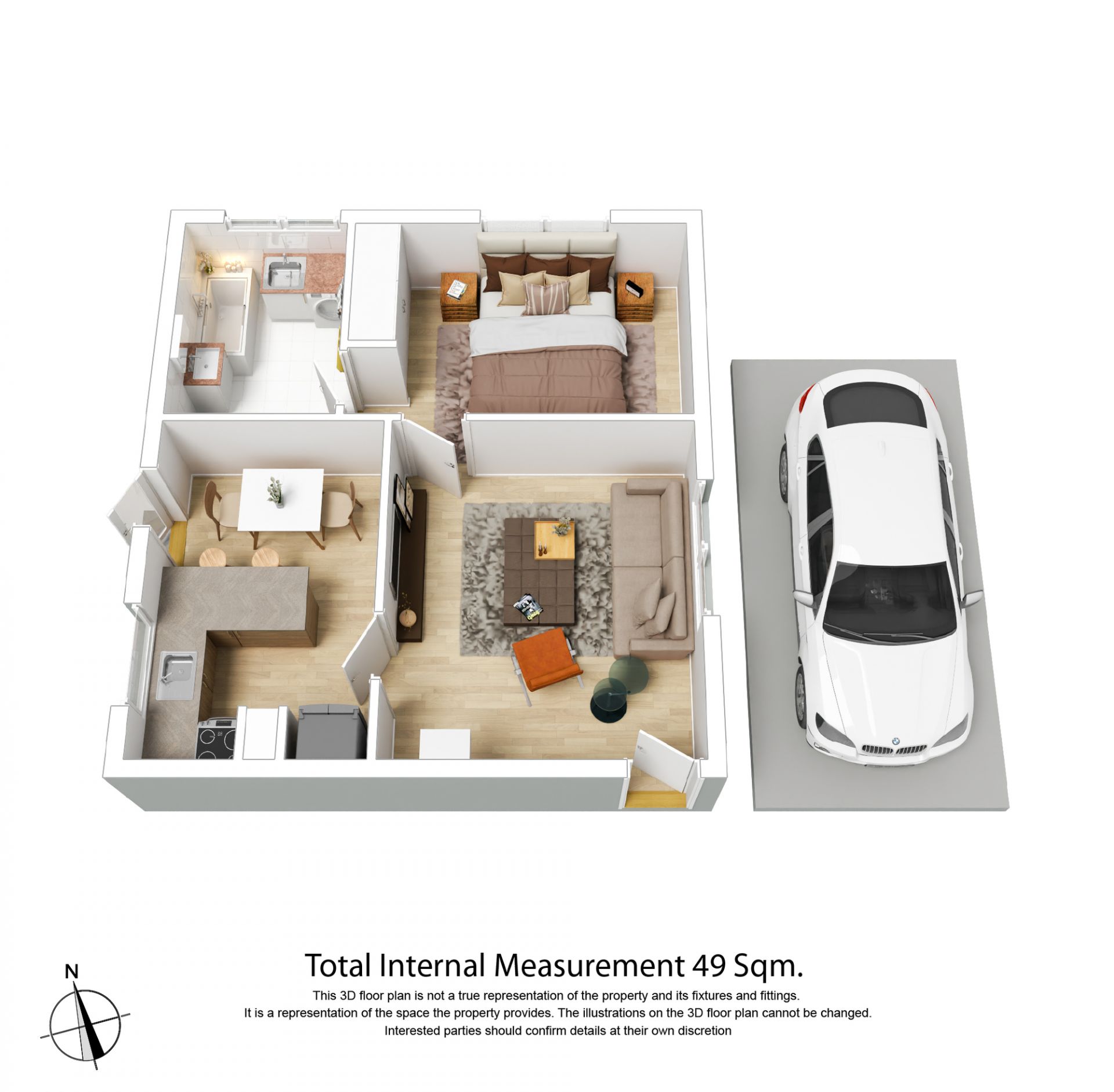 • One bedroom with a built-in robe and direct access to generous bathroom/laundry