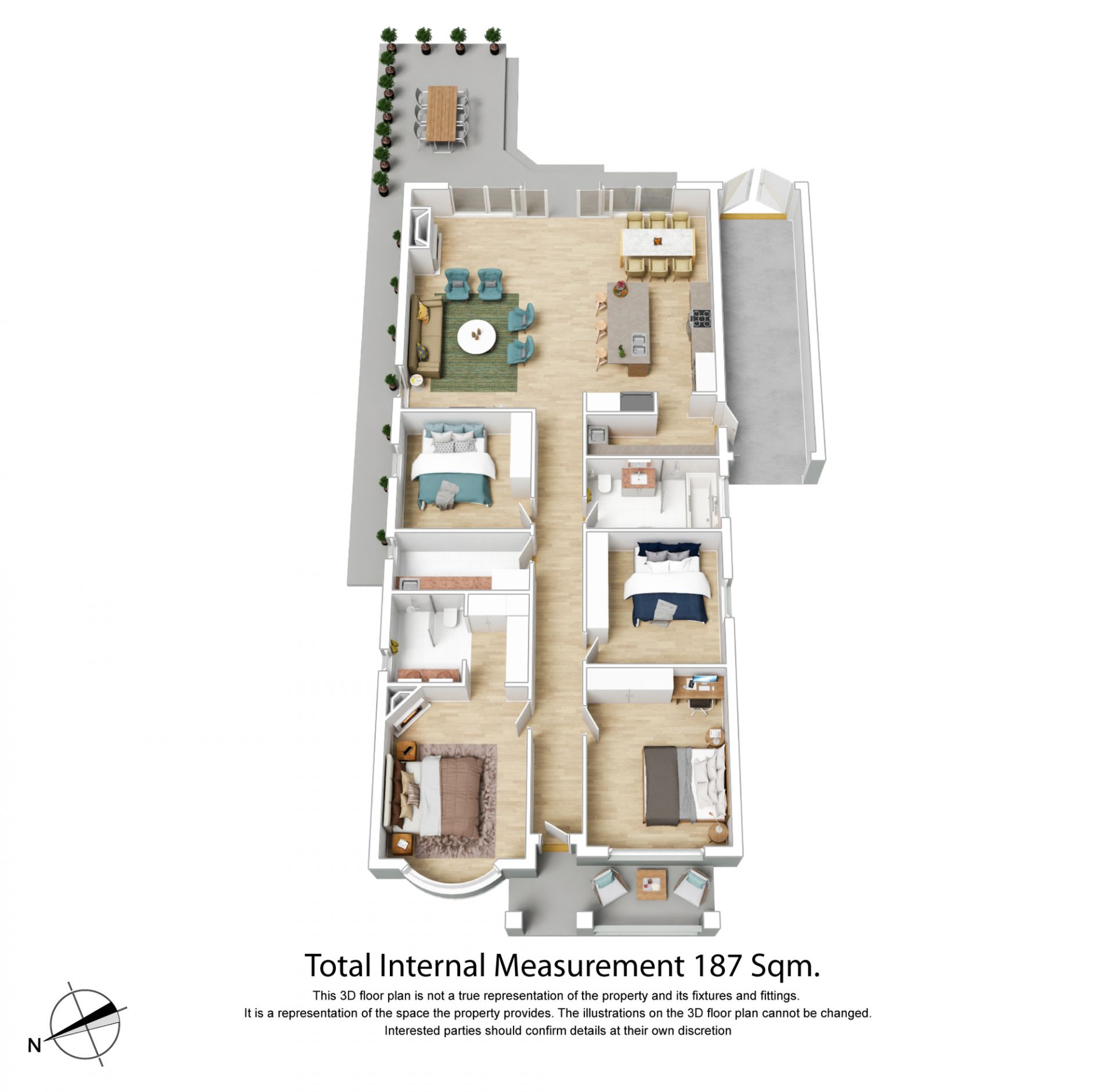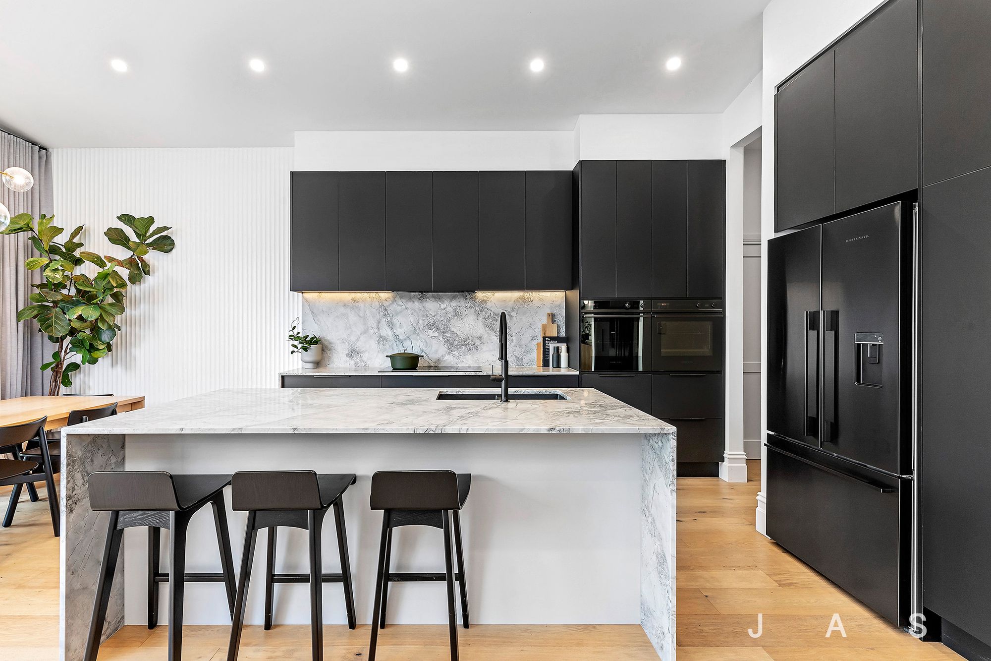 Crowned by a soaring raked ceiling and flooded with natural light, the open-plan living space delivers a designer kitchen joined by generous living and dining spaces. The kitchen’s stone benchtops and top-quality appliances join a long list of luxury inclusions, including a large butler’s pantry, a four-seater island bench and timelessly elegant soft-close cabinetry.