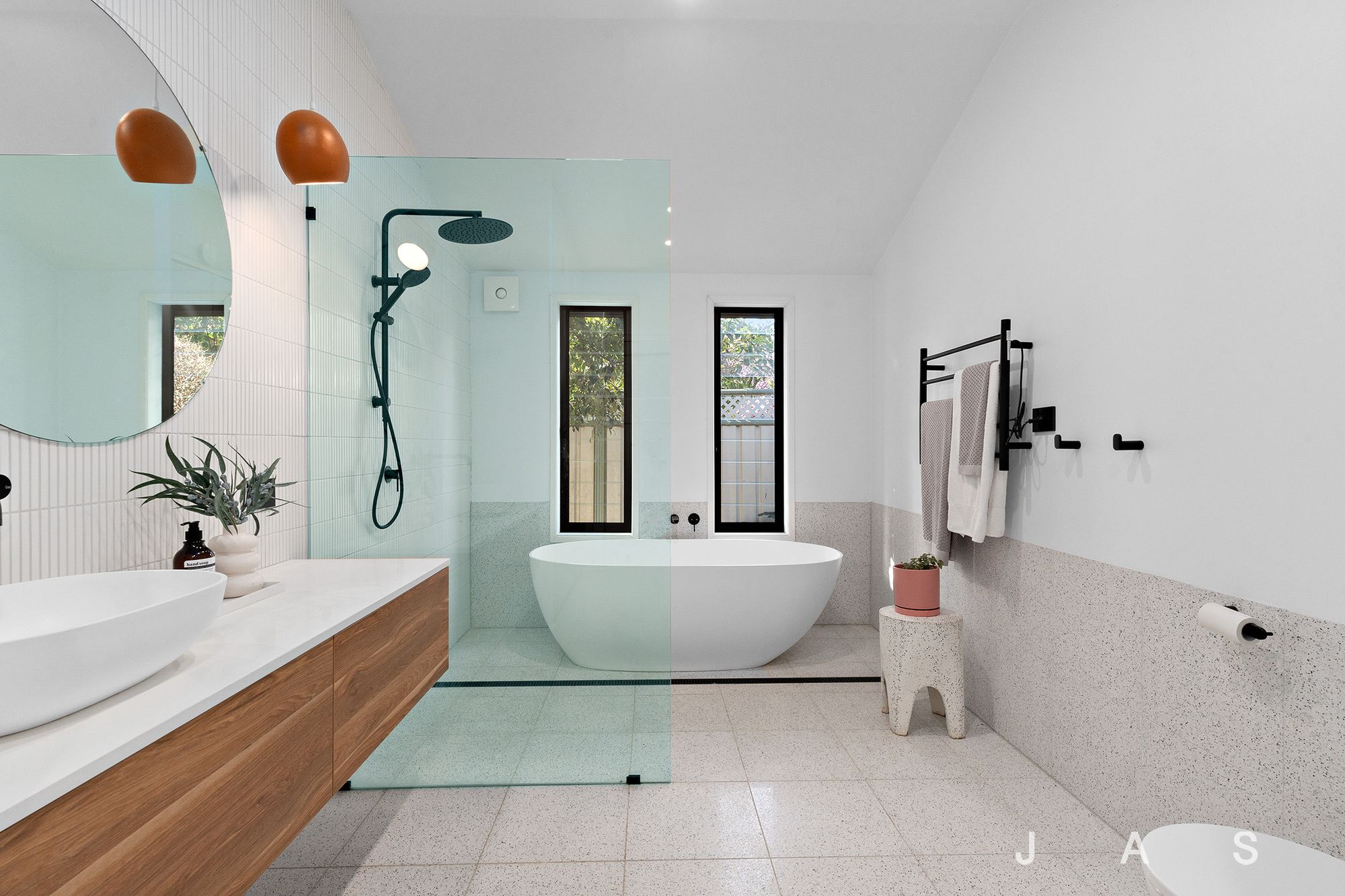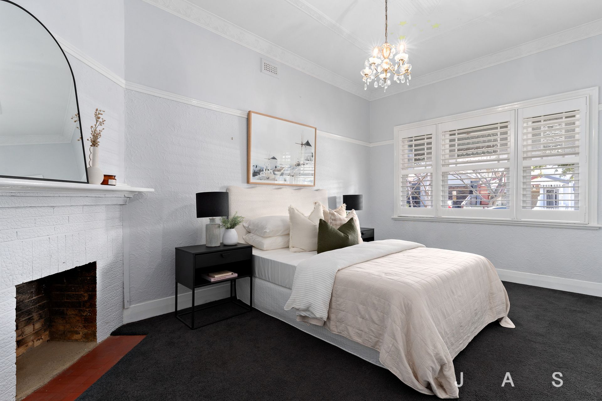 The luxurious master suite offers a dreamy retreat, with a large walk-in robe and a fully-tiled ensuite with a walk-in rainfall shower. The second bedroom enjoys excellent storage and a built-in desk, while the oversized third bedroom boasts a period fireplace and front garden views and could also be used as a formal lounge. Taking the luxury up a notch is the spectacular main bathroom, where terrazzo and matchstick tiling provide a stylish backdrop for an inviting bathtub and a rainfall shower.
