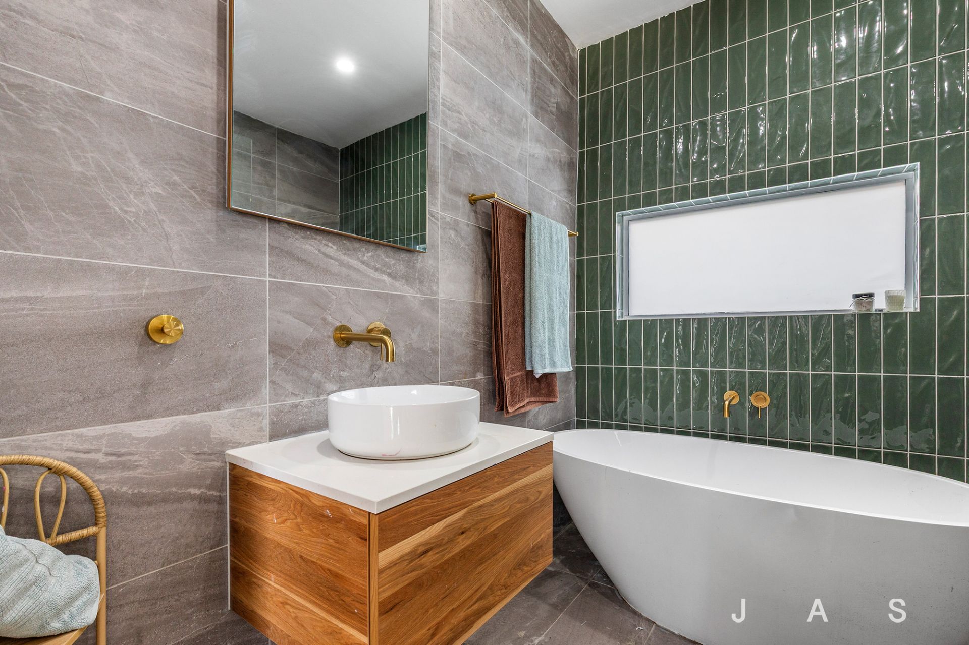 When it’s time to rest, four bedrooms with built-in robes are served by three bathrooms for superb family convenience, including the stunning main bathroom, where feature floor-to-ceiling tiling sets a stylish backdrop for a luxe bathtub, rainfall shower and a chic stone-topped timber vanity.