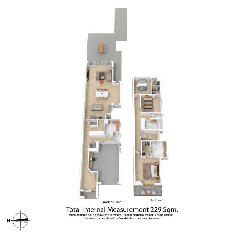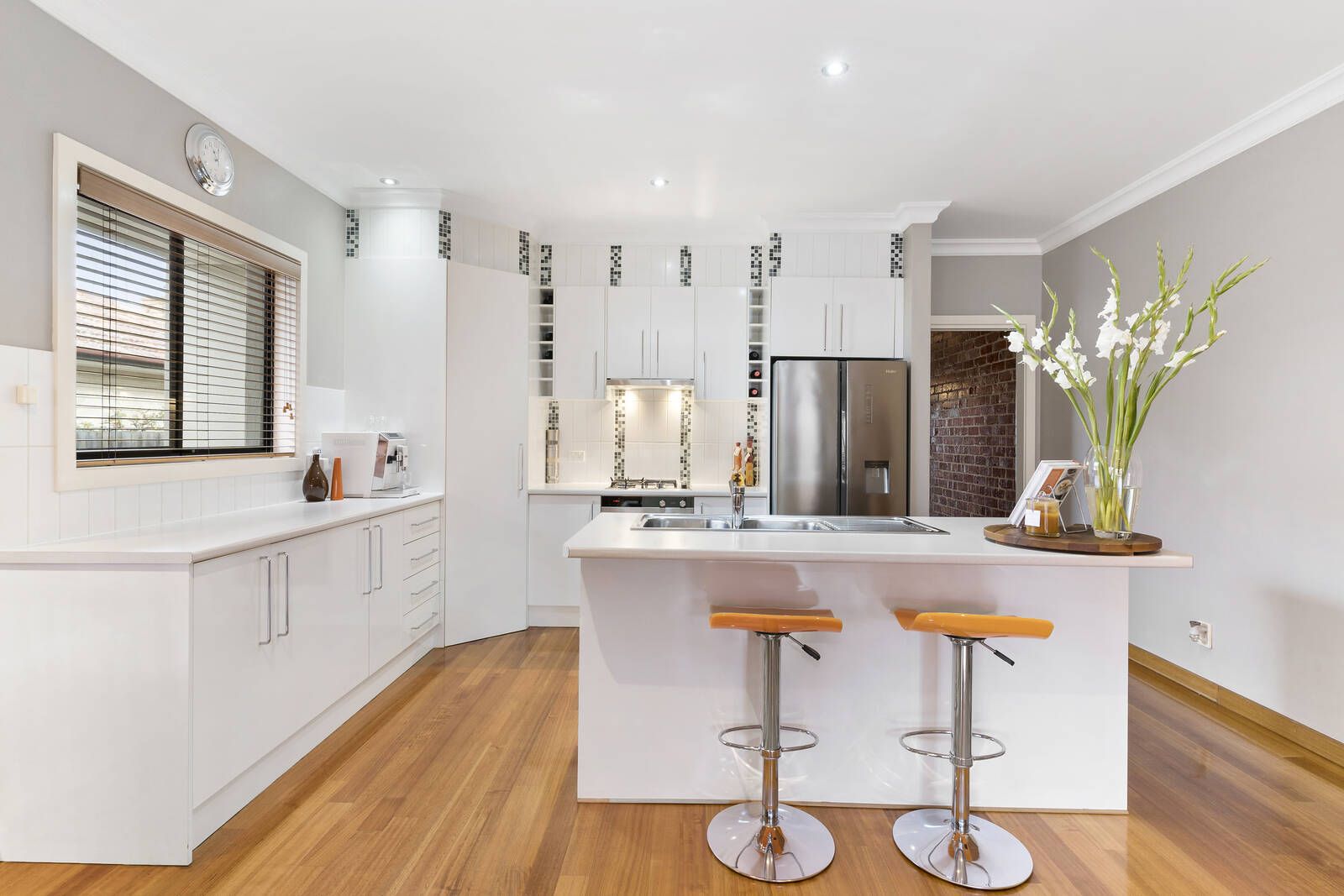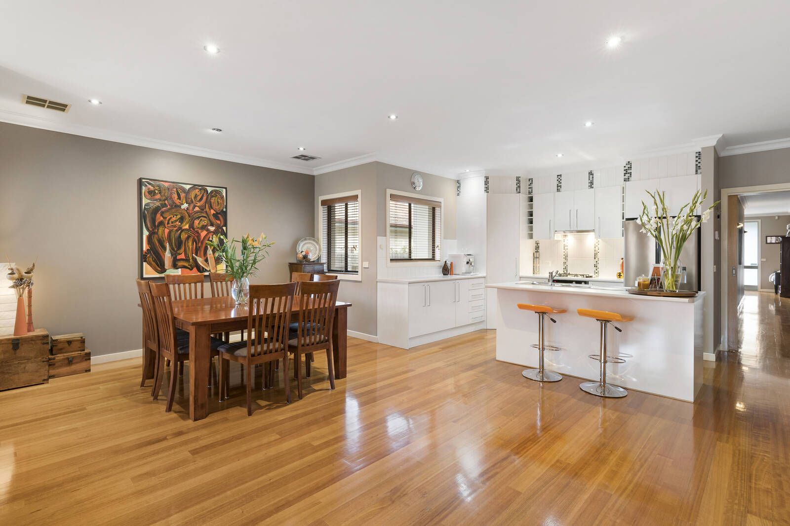 Polished floors and pleasing dimensions define living and dining areas that flow to an outdoor backdrop where decking, depth and a majestic mature palm tree leave a lasting impression. An open-plan kitchen contributes contemporary style to downstairs spaces that are complemented by a clever study zone.