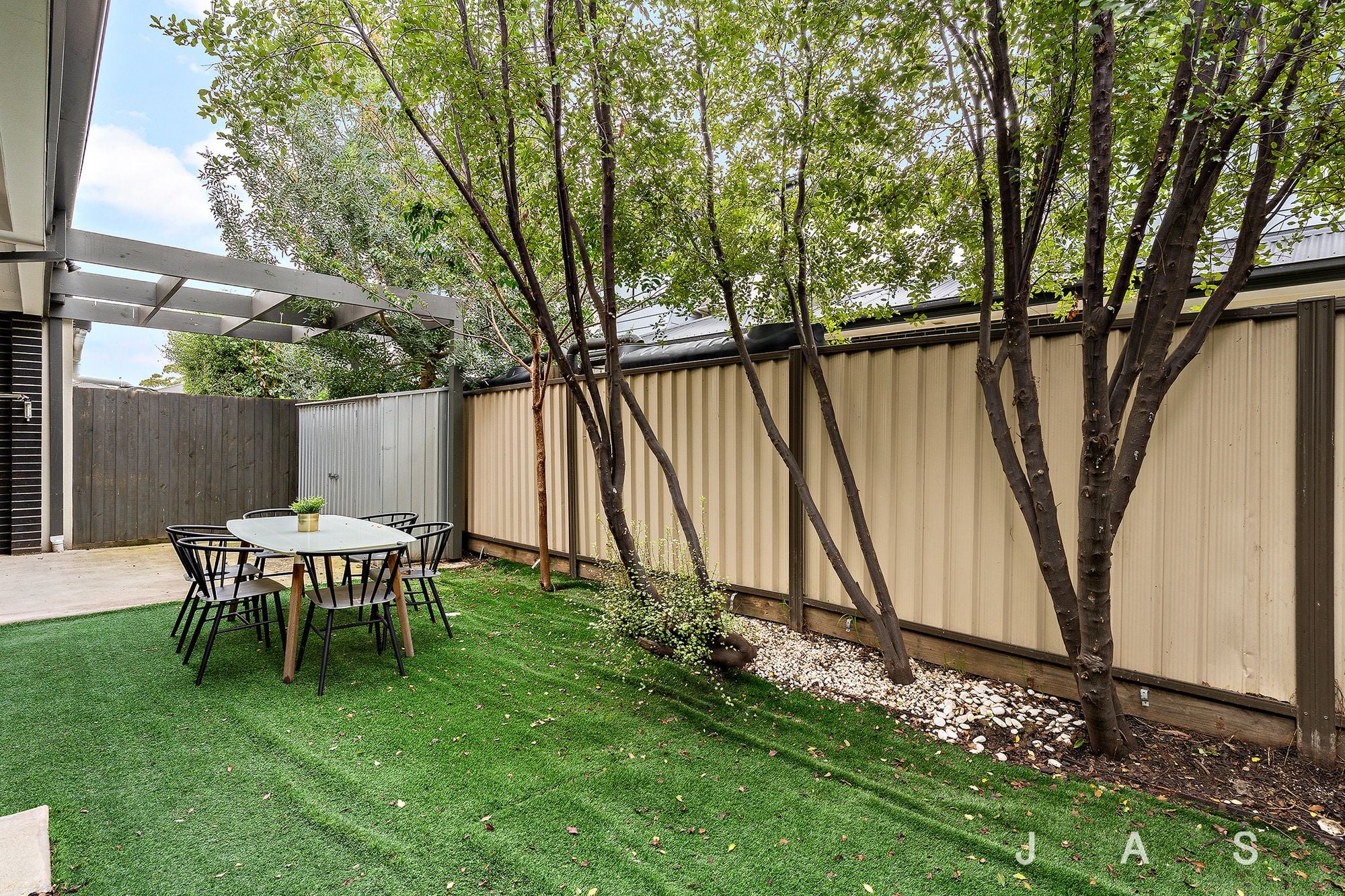 • Low-maintenance entertainer’s courtyard with covered deck and established shade trees