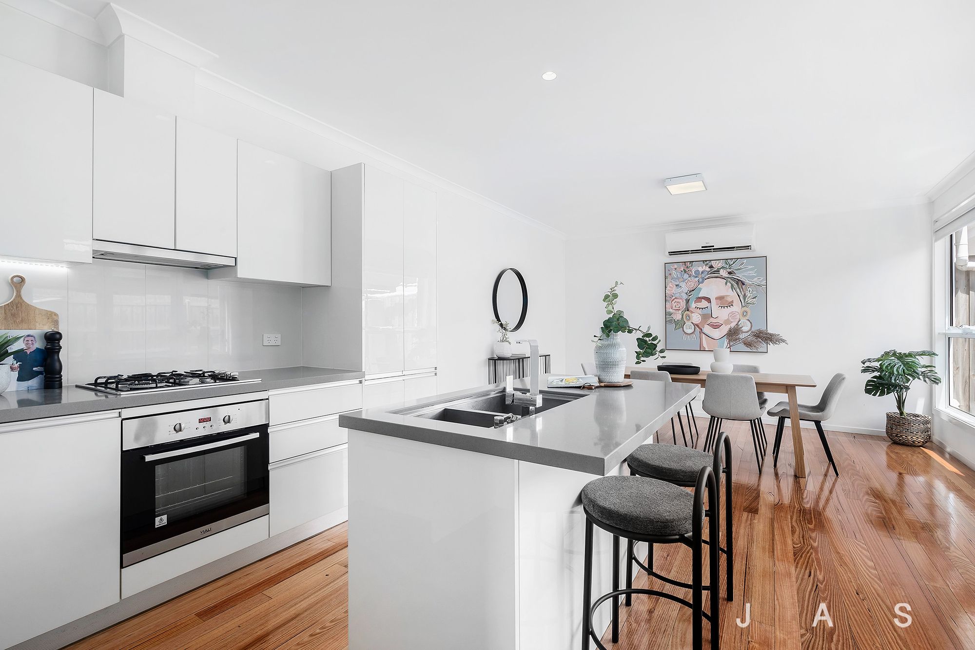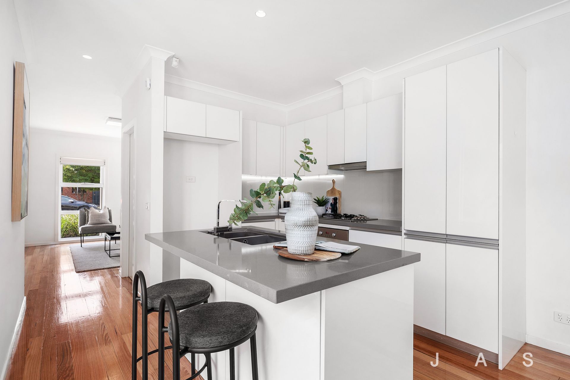 Step inside to be instantly welcomed by the sunny open-plan living space, drenched in natural light and underscored by honey-hued timber floorboards. The space flows effortlessly through to the open-plan kitchen/dining area, where a well-appointed stone-topped kitchen offers quality stainless-steel appliances and a breakfast bar ideal for casual dining.