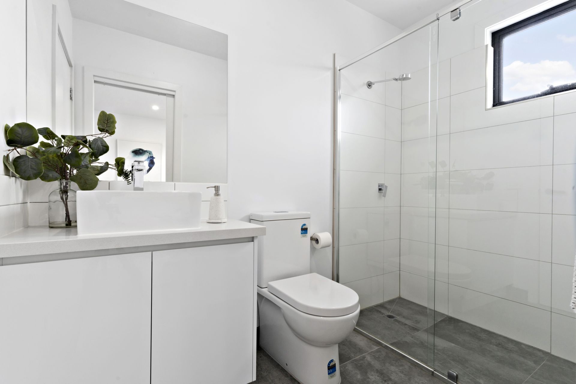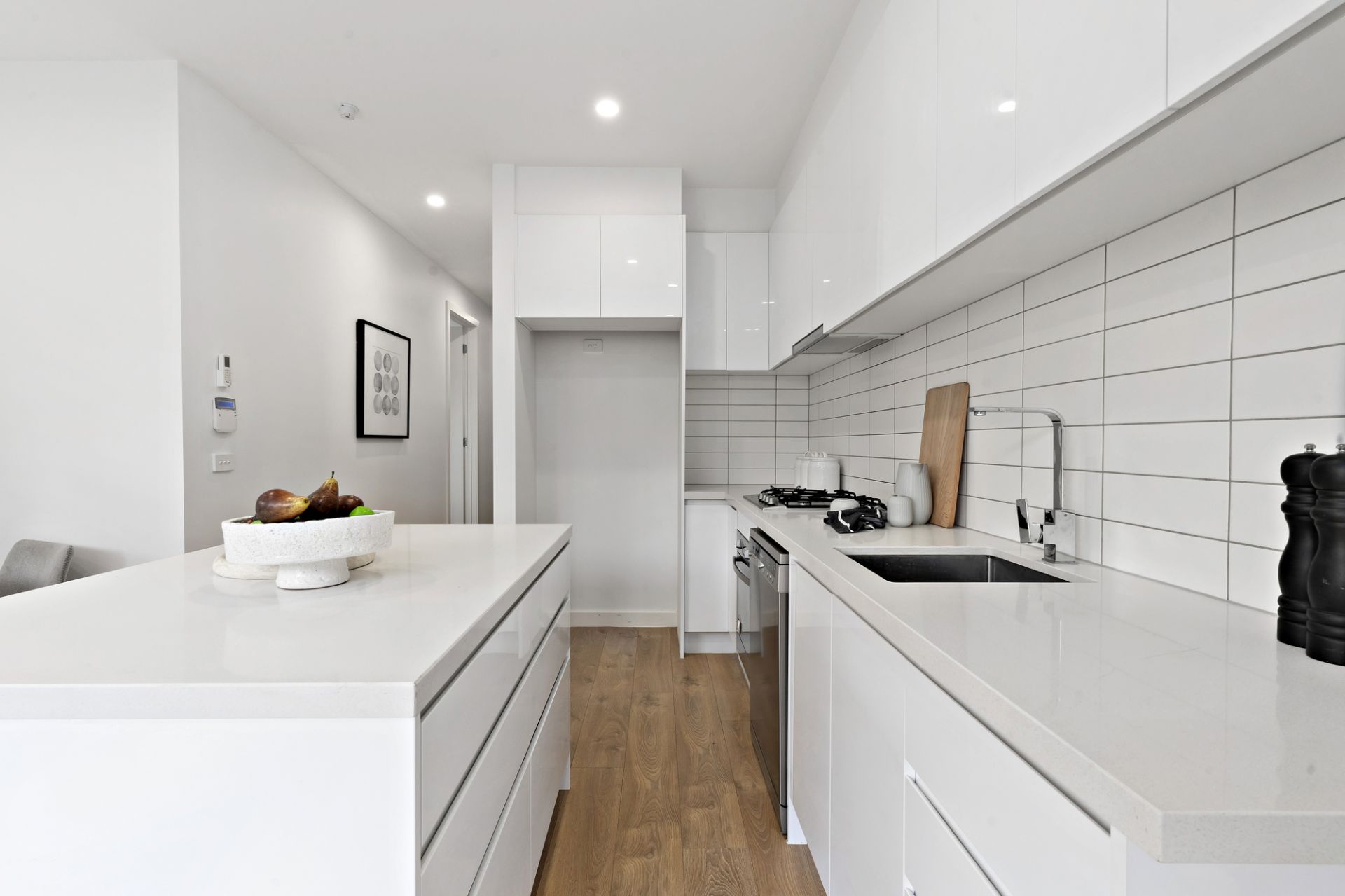 Stunning engineered timber floorboards sweep throughout the lower level, highlighting the large master bedroom with built-in robe and ensuite and through to the spacious open-plan living zone. Generous lounge and dining spaces are joined by a sleek all-white kitchen with stone benchtops, stainless steel appliances and an island bench with breakfast bar, ideal for casual dining.
