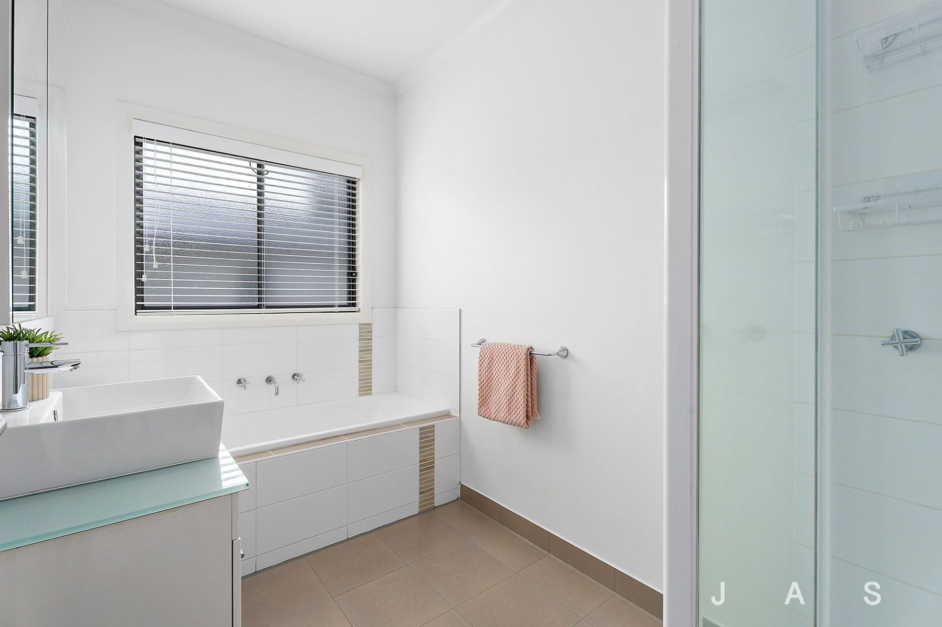 • Inviting bathroom with inset bath, shower and separate powder room
