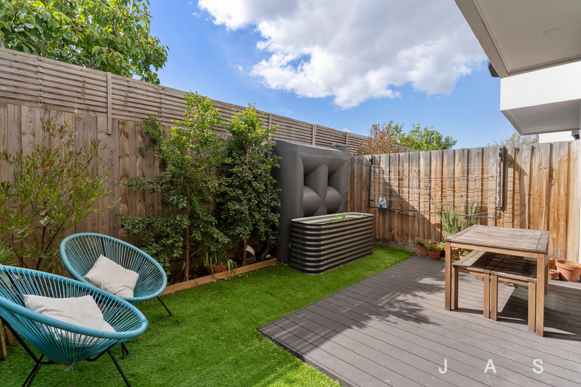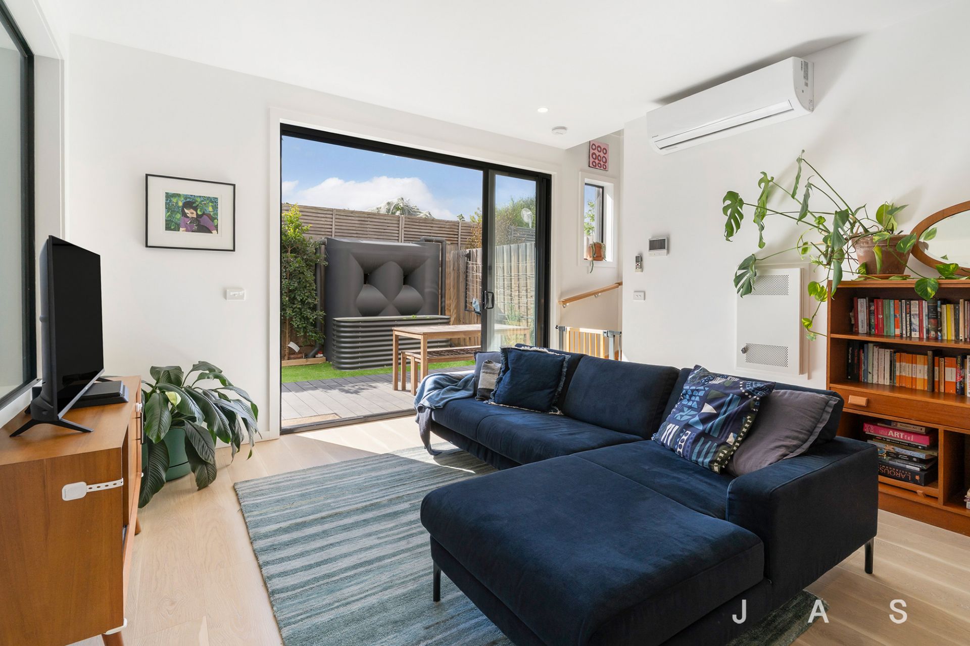 Sliding doors extend the living space to the easy-care entertainer’s garden, where you’ll enjoy summer meals with friends on the deck and synthetic turf offers an ideal outdoor play area for young children and pets.