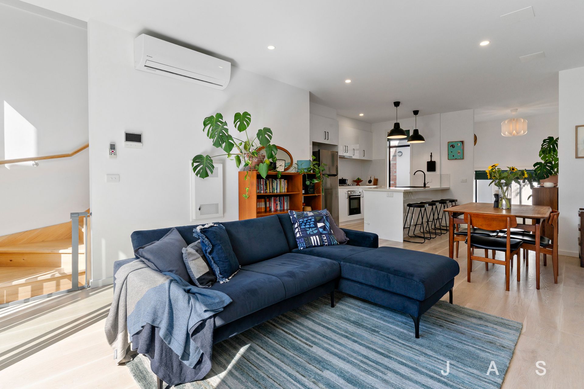 Underscored by engineered timber floorboards, the lower level delivers a sunny open-plan hub offering living and dining zones and a beautifully appointed stone-topped kitchen with stainless steel appliances and a pendant-lit breakfast bar perfect for casual meals.