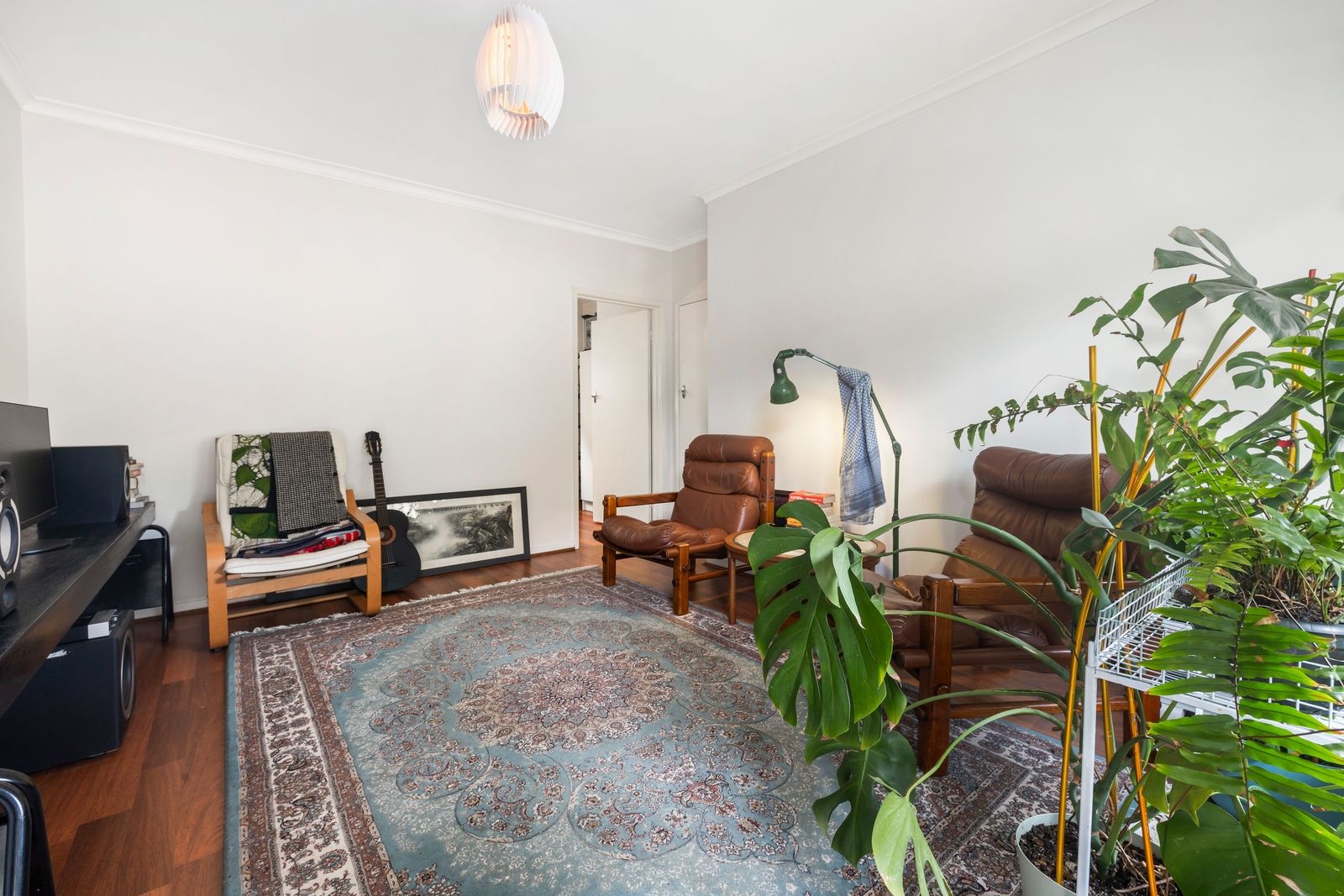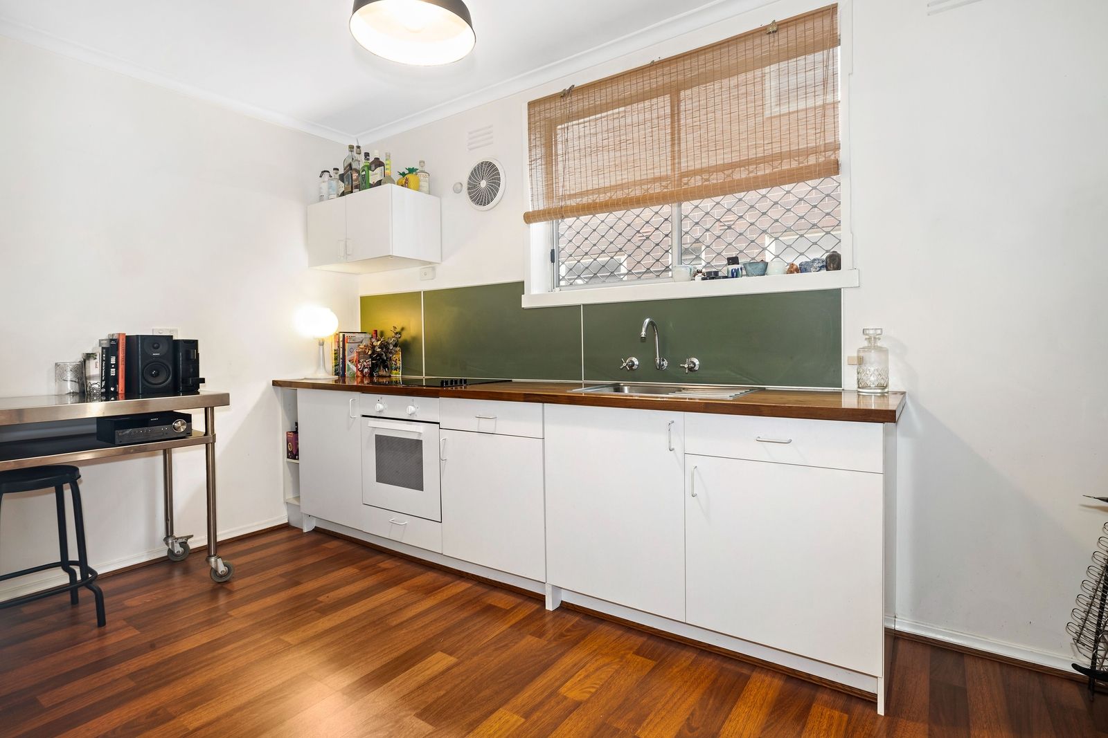 Step inside to be instantly welcomed by the sunny living room, where timber-look floors set the scene and a large window attracts plenty of natural light. The adjoining kitchen/dining room’s sage green splashback and timber benchtop create a stylish impression, while electric cooking and plenty of space for a dining table add extra appeal.