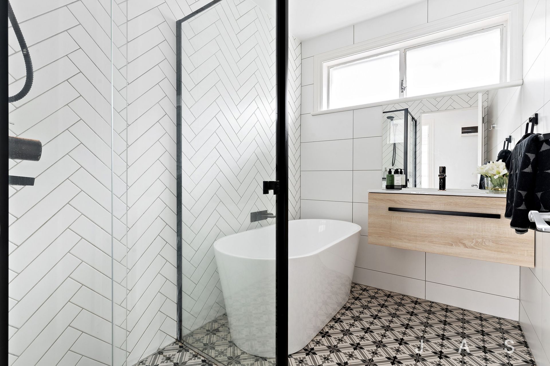 Both bedrooms offer built-in robes and share the stunning bathroom, where feature tiling and black fixtures set the perfect backdrop for everyday luxury.